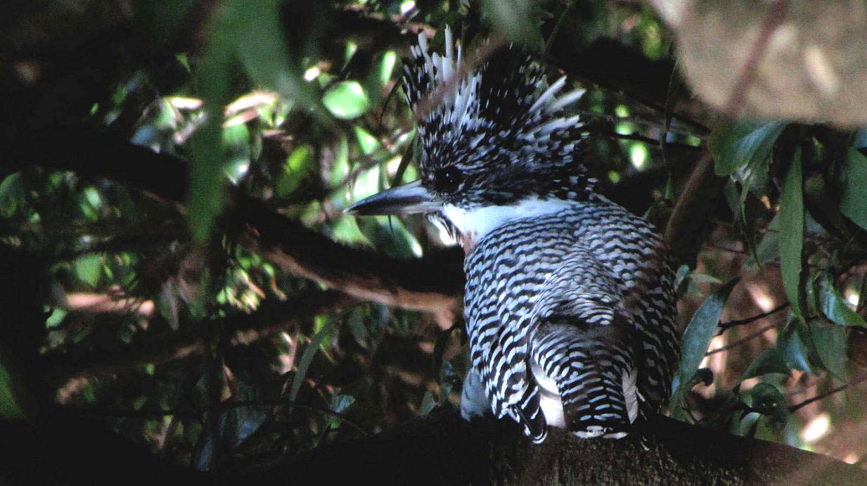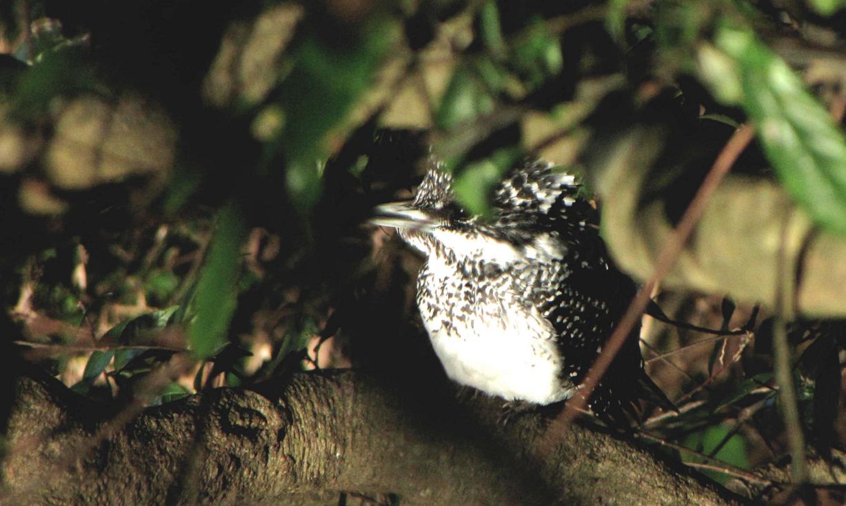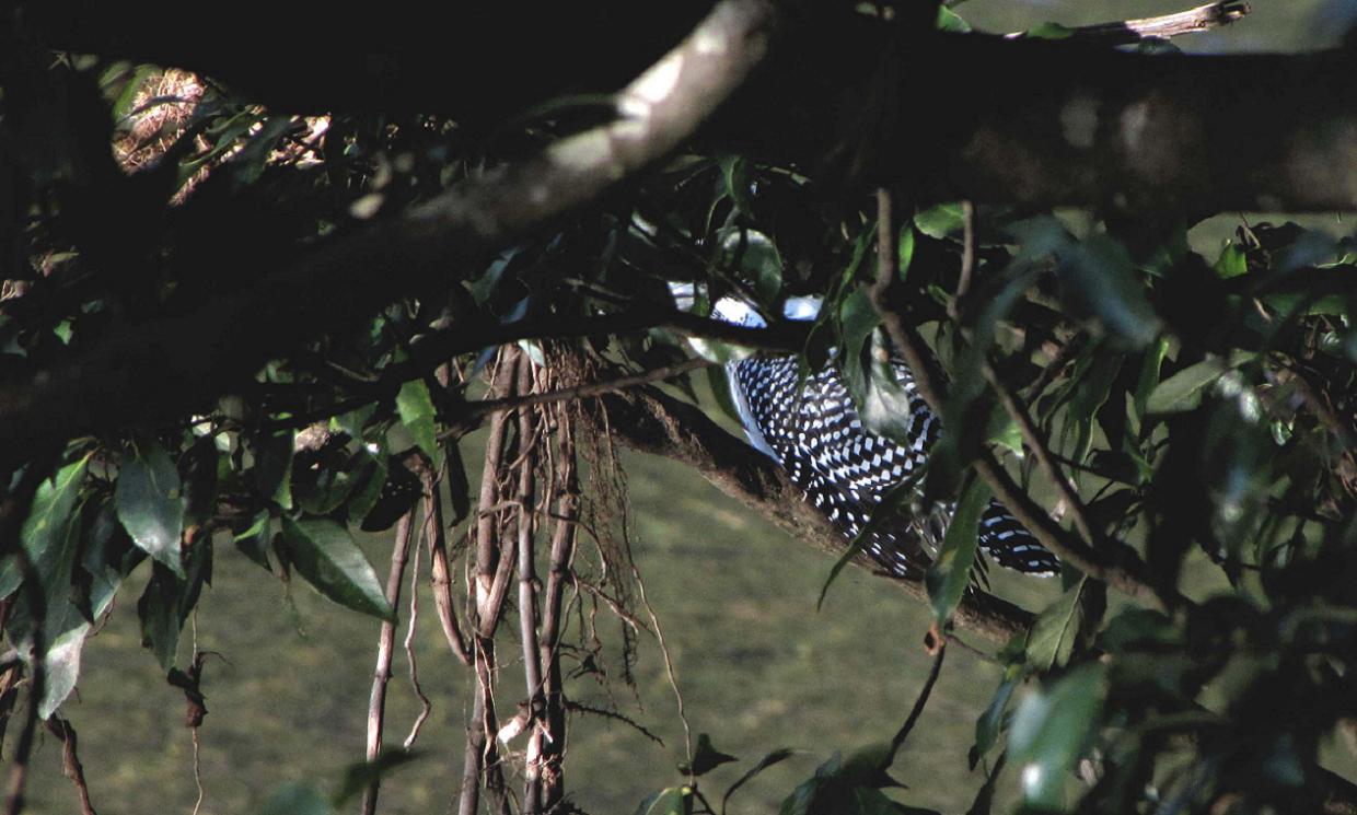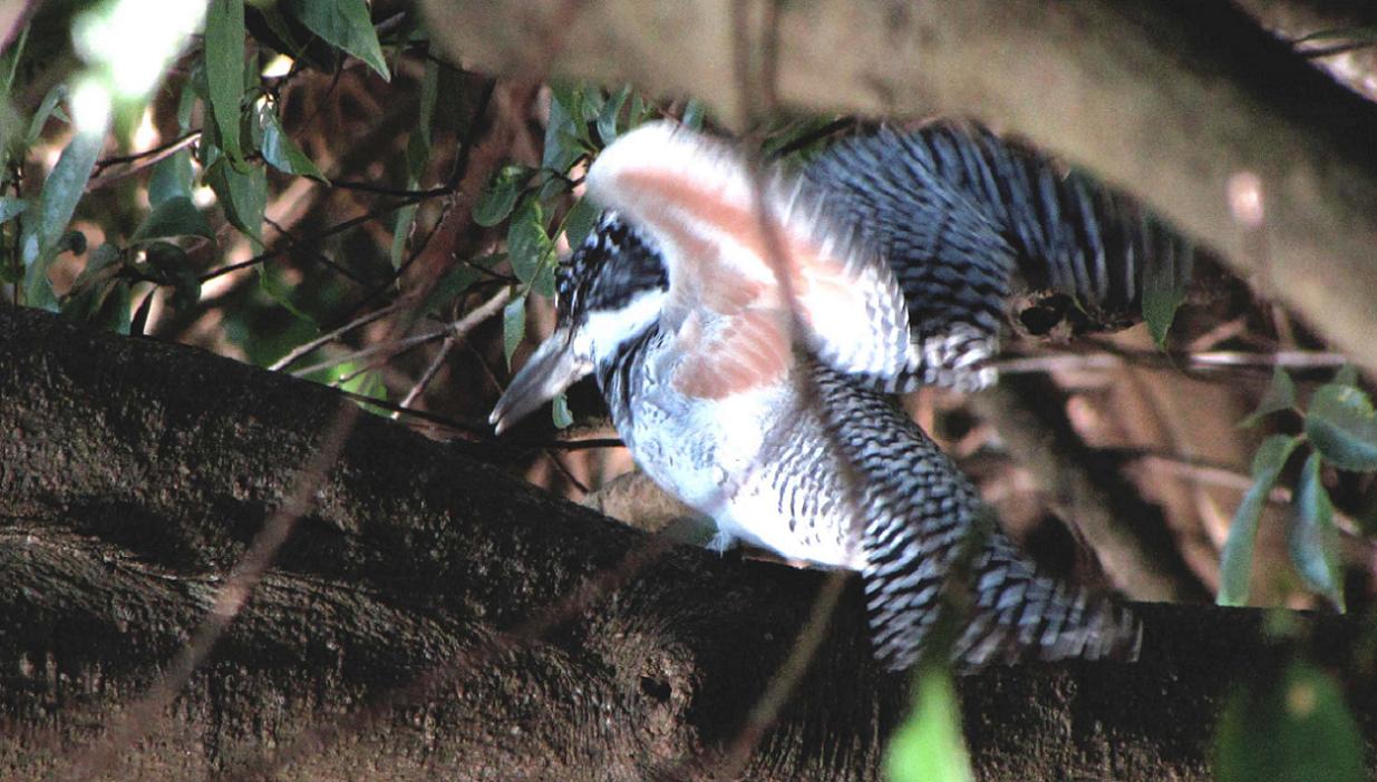 やむをえず、鉈を変な方向へ投げて、そちらでバサッと音を出しました。気付いたヤマセミは、無言で飛び出て上流へと去っていきます。今度は同じ場所から、休憩場所の蔓も写せる様に、葉っぱを取り除いて今日の鳥見を終了です。