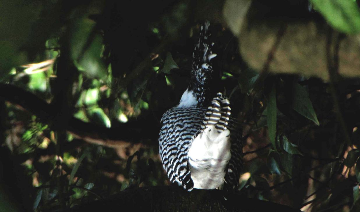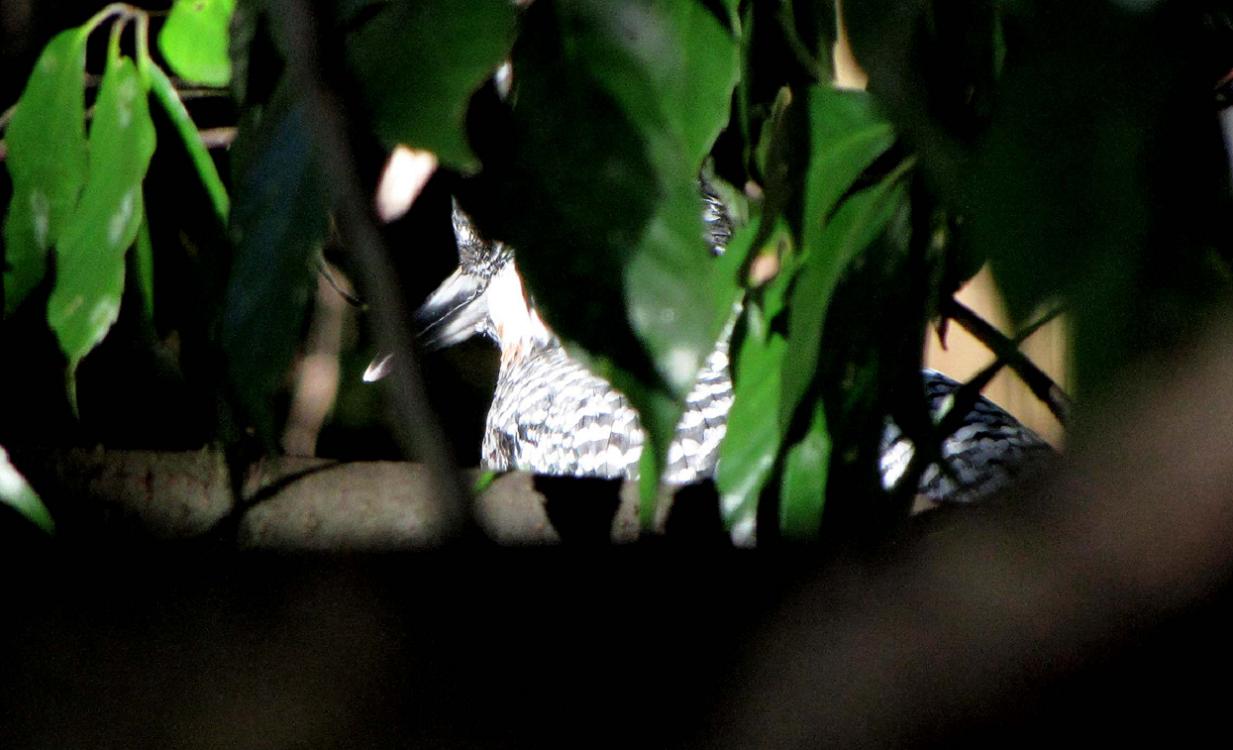 驚いたのは5m先の蔓に留まって休憩する事でした。こちらからは、完全に葉っぱの影になっています。3回留まって、合計一時間以上はジ~ッとしています。他へは行こうとしないのです。こちらも帰らないといけないのに、私が動いて彼を驚かせ、隠れ場所を知られたくないのです。