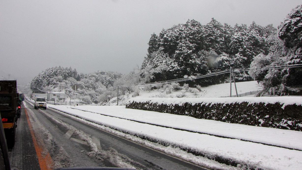 通勤割引が効く時間帯に高速に乗りましたが、雪で通行止めとなった別府で降ろされてしまいました。迂回は国道10号線です。でもここでも大変な事になり、立石峠では本当にノロノロ運転でした。