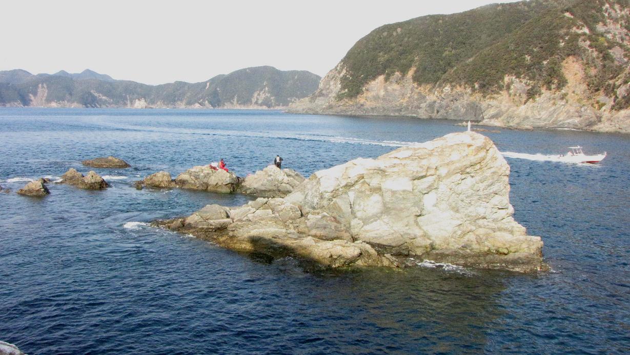 抽選で一緒に上がったのは22歳?の秋好君で、磯釣りは数回目だそうです。防波堤の釣りもしていたけど、フカセ釣りの魅力に惹かれた若者でした。場所は大分県佐伯市米水津の磯で、“ラクダ”と言う磯です。