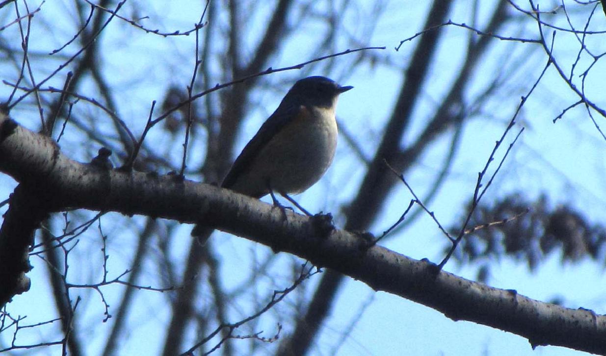 カッカ・カッカ・・・ジョウビタキかルリビタキの声がします。その声は移動しながら逆光の場所にシルエットを現しました。尻尾が短いのでルリビタキ?写真に撮って確認すると、オスのルリビタキと判明したのです。