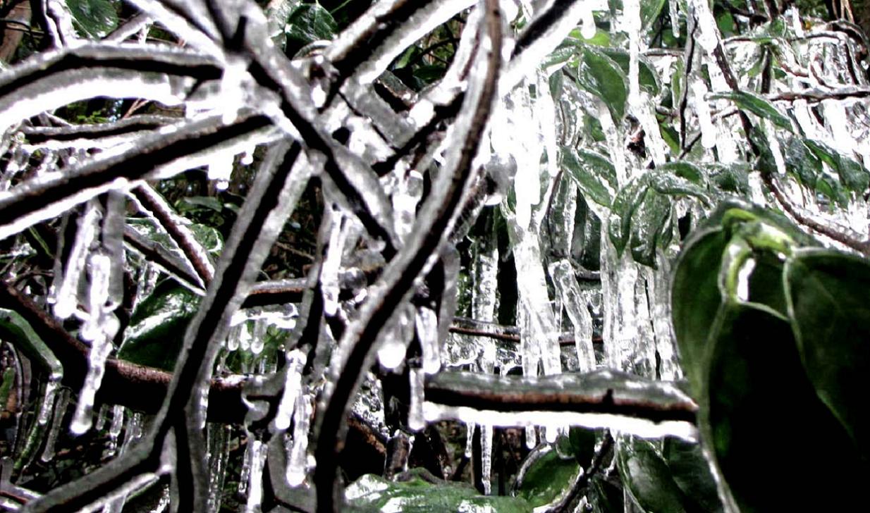 7時40分で-2度の世界でした。送水パイプの水が凍ってツララです