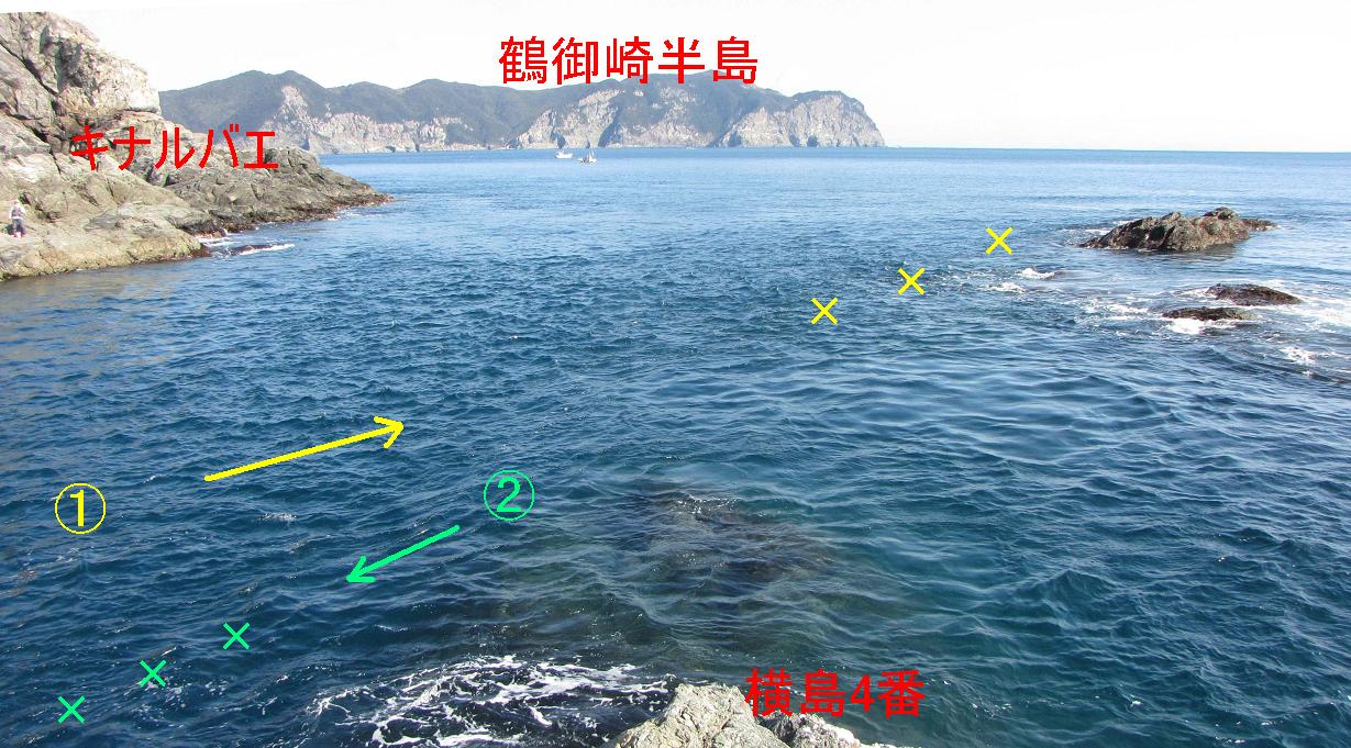 下げ潮は②から潮筋が出来るので磯近くを狙えます。大型のクチブトの多い所で、やはりオナガも当たってきます。こちらの方が取り込みは楽でしょう。