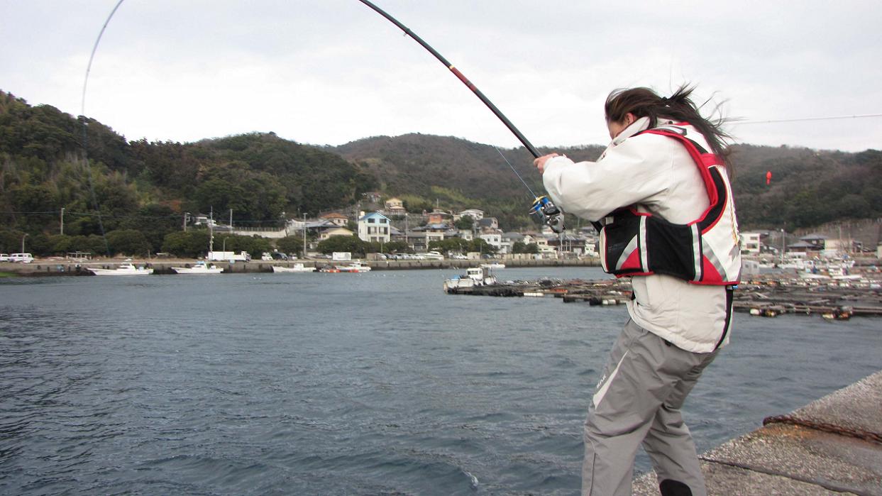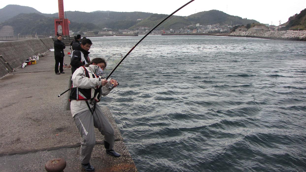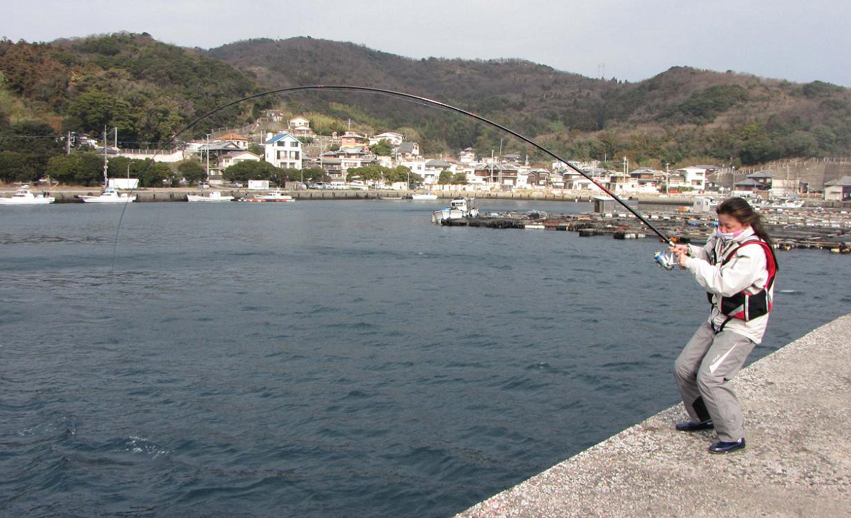 左手を使ったハンドドラグでスプールの逆転を止め、リールを巻く時だけハンドドラグを開放するテクニックで、沖に走ったカンダイは再び波止際に戻ってきます。