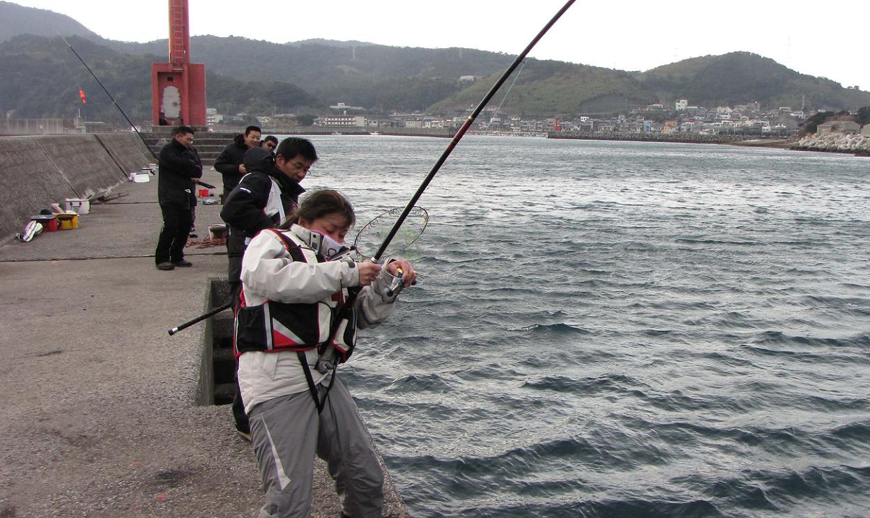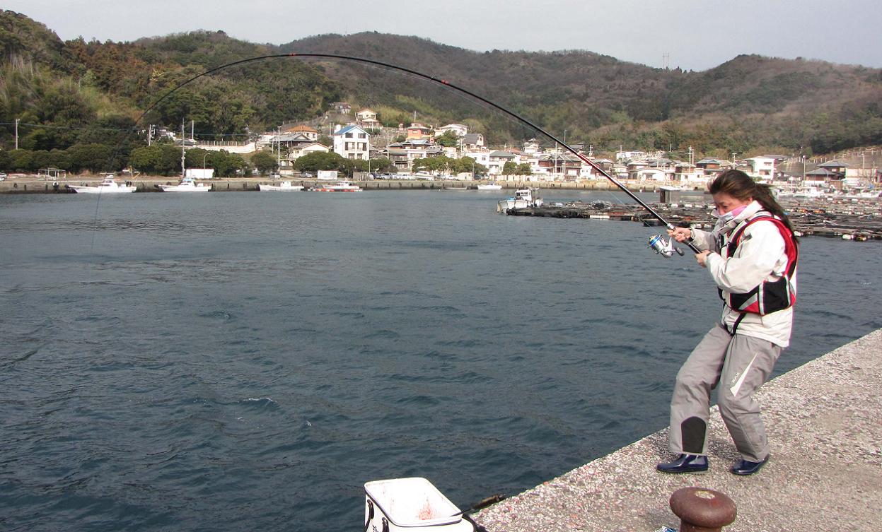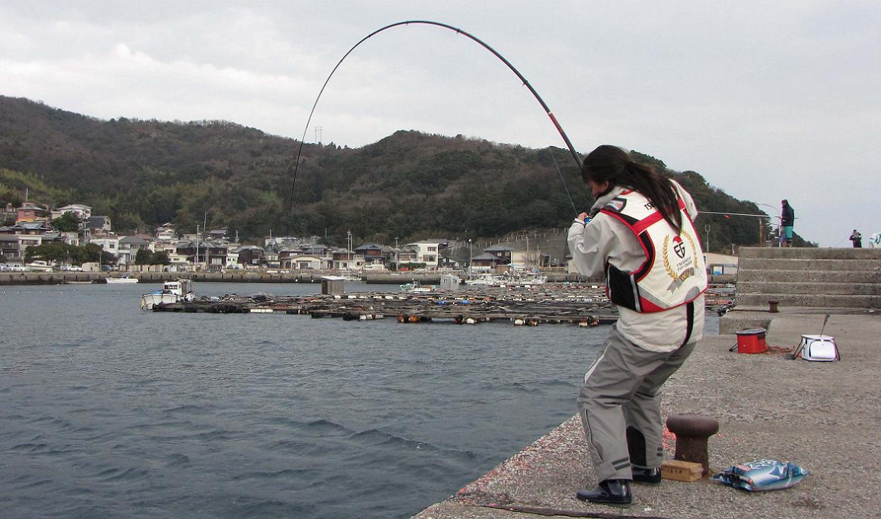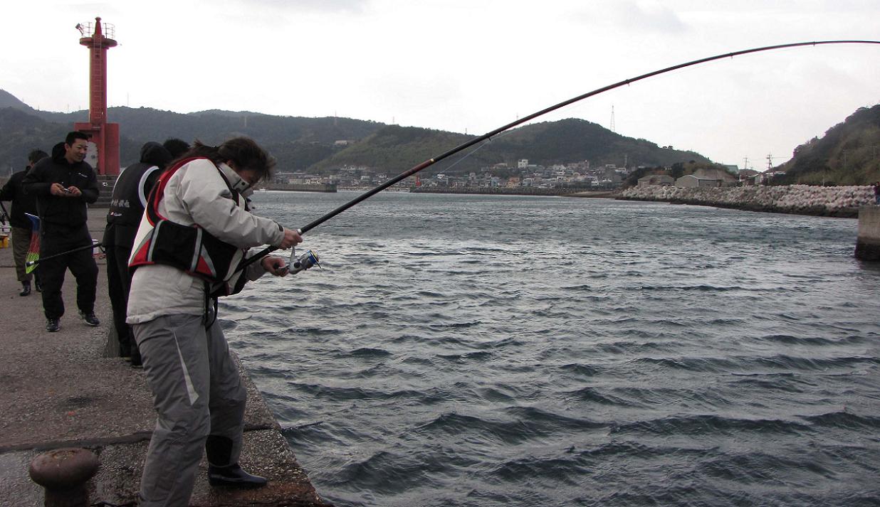 いずみねーさんの顔が真っ赤に染まりました。ココで主導権はいずみねーさんに移ったのです。歯を食いしばりリールを巻きました。無我夢中です。カンダイは、いずみねーさんのパワーと、パワースペシャルフカセー5号の反発力に負け、徐々に浮き始めます。何度かの反撃にも、二度と糸を出さないいずみねーさんに、大物カンダイもギブアップしてしまいました。