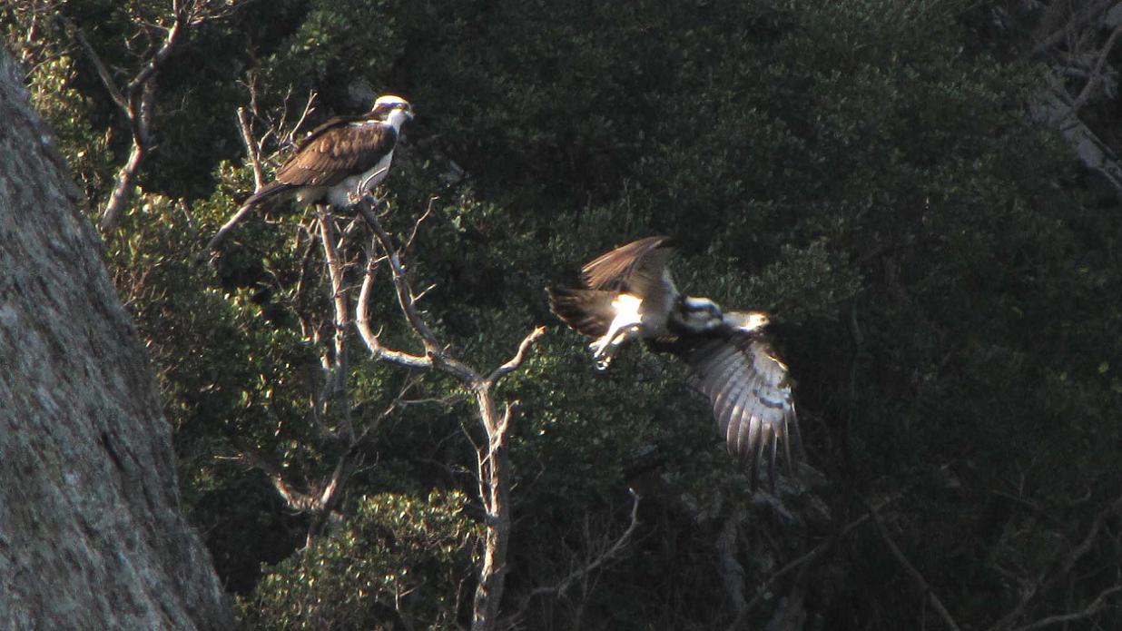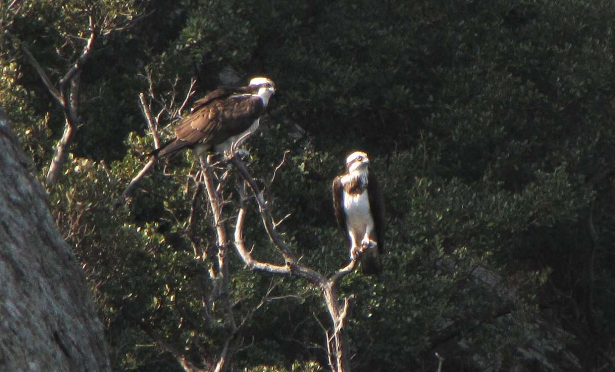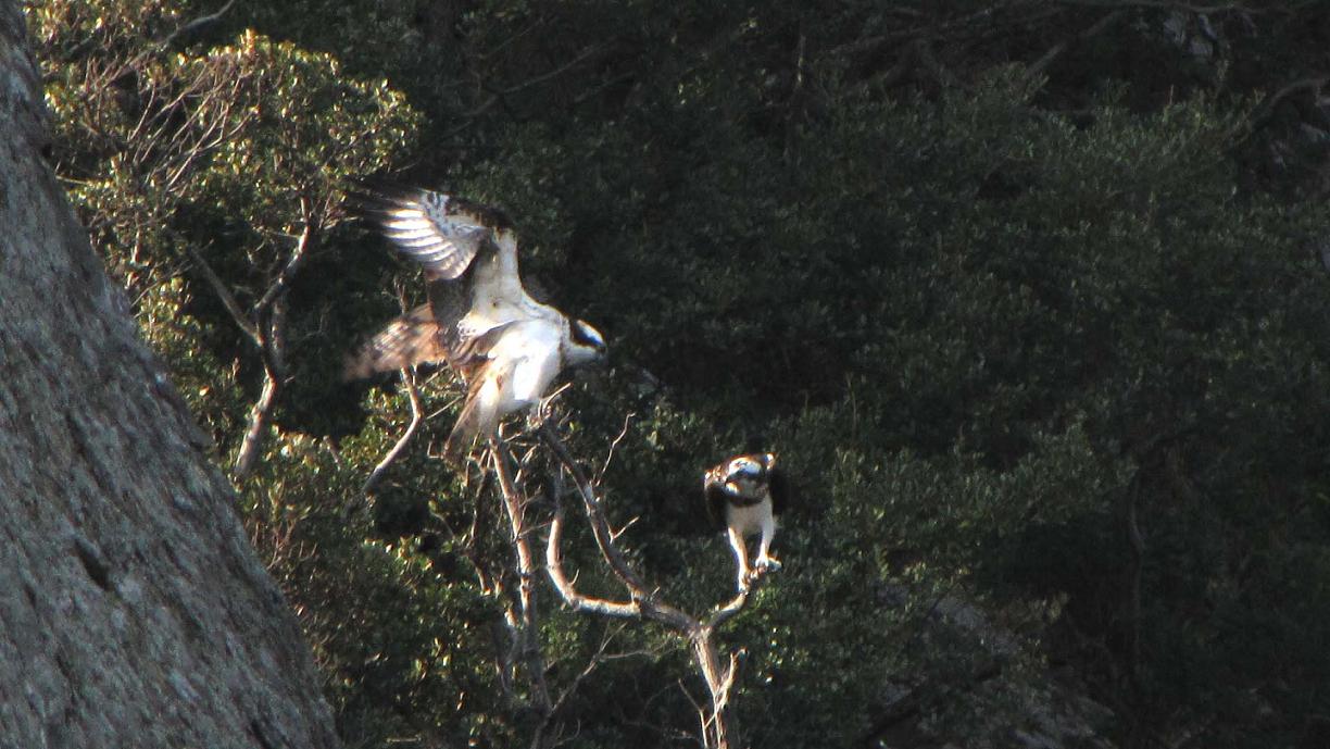 200m先の対岸で、海抜30~40mの岩の頂上付近に行き来して、なにやらゴソゴソしています。その周辺を良く見るともう一羽がジ~ッとしています。どうやら見張りをしている感じです。巣を作っているのかもしれませんね。