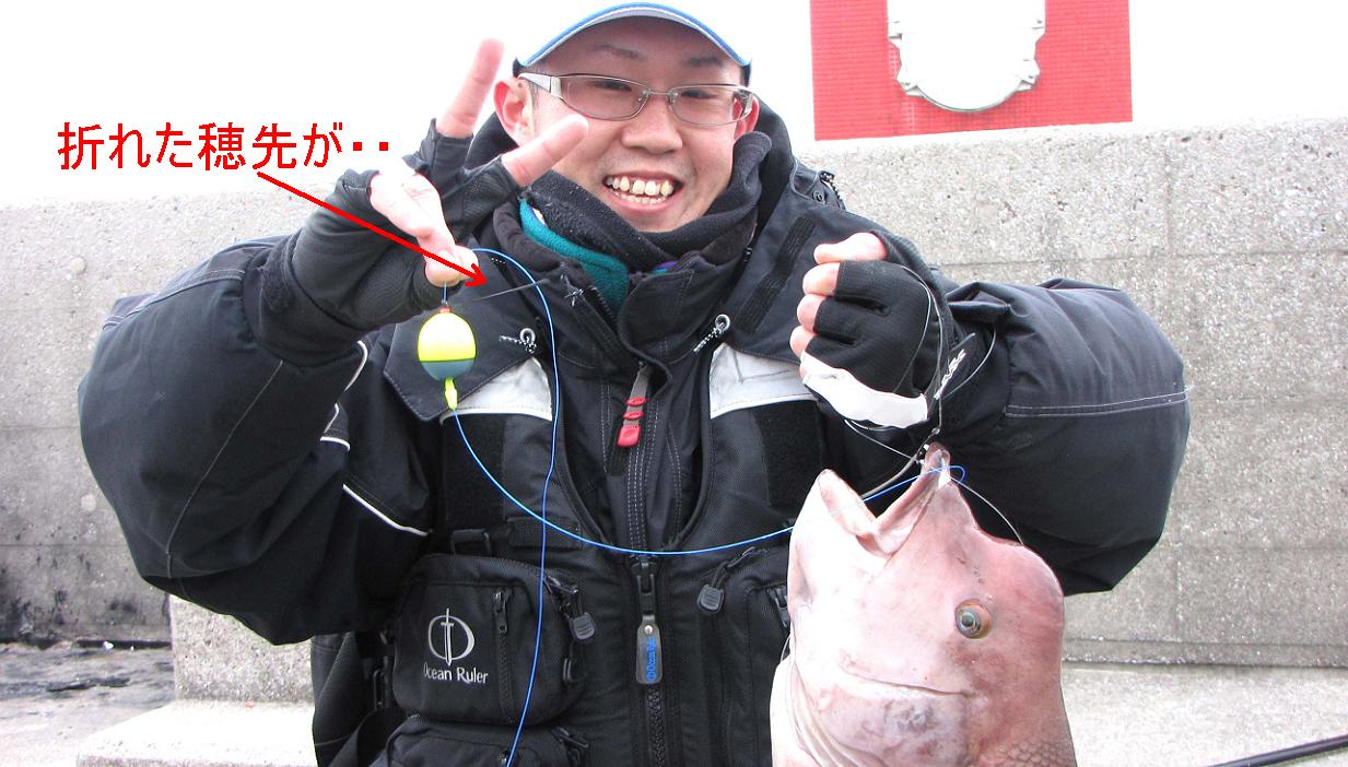 私の仕掛けで二人が交互に釣ります。先ずは日高君、二投目でカンダイを掛けてくれました。少しの戦いで浮いてきたのは3.6kg、でも、リールを巻きすぎて穂先がグニャリ、横から道糸を引き出そうとしたけど、日高君のベールを起こす動作が一早く、穂先がポッキン\(◎o◎)/!