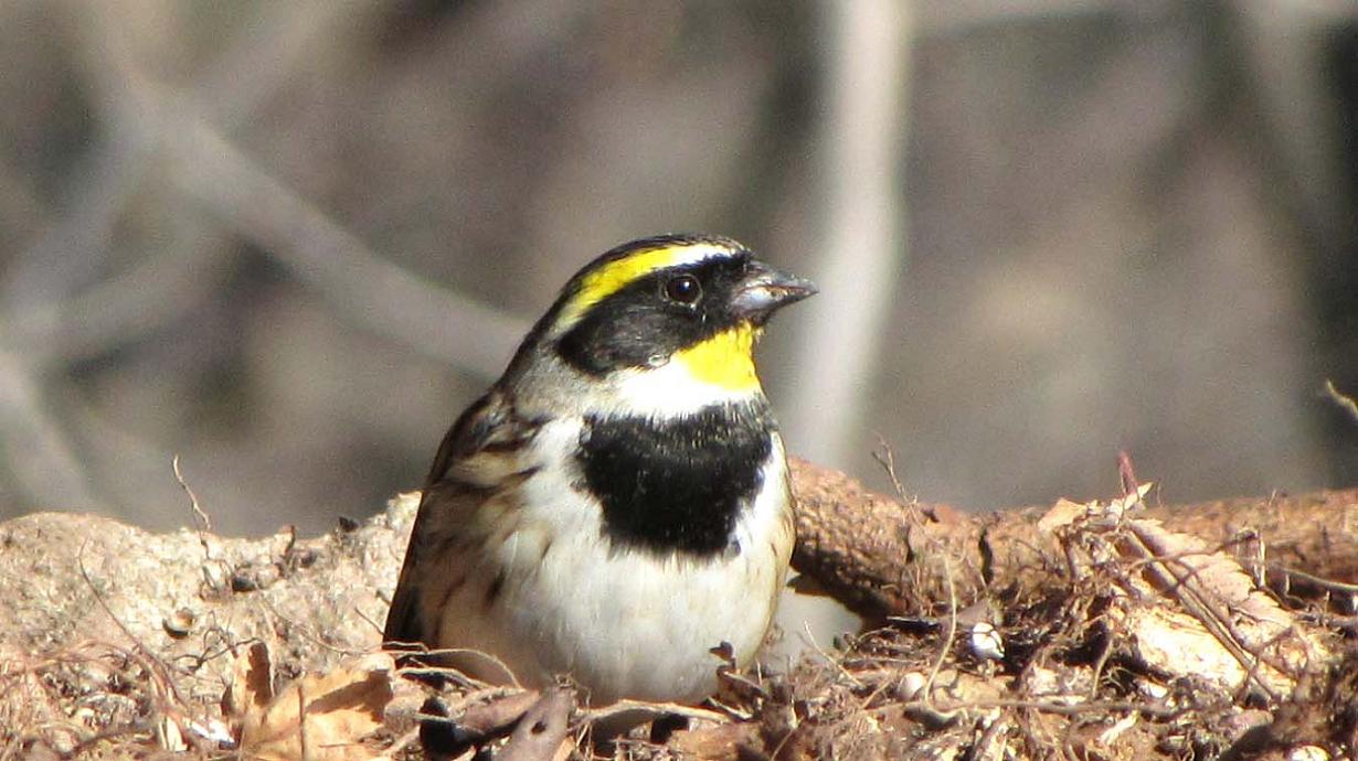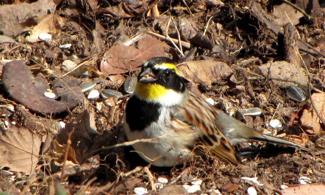 オスのミヤマホオジロは、餌場の近くでグゼリ始めています