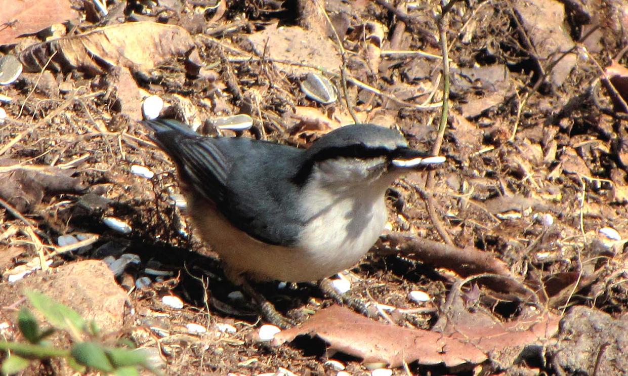 今日も少しの間だけ待っていたら、直ぐ傍にゴジュウカラが来ました。木を逆さまに降りたりしていたので絵にしていると・・・いきなり地上に降り、チョコチョコ跳ねてエサを物色後、押しムギを咥えて去っていきました。