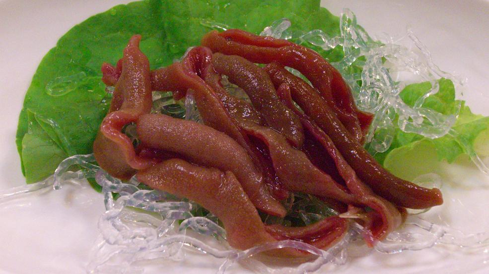 次の日の食事は、打ち上げを兼ねた海産物の夕食で、色々な刺身などが卓上に並んだ。代表的な珍味がユムシの刺身、コリコリして噛むと甘味が増してくる。