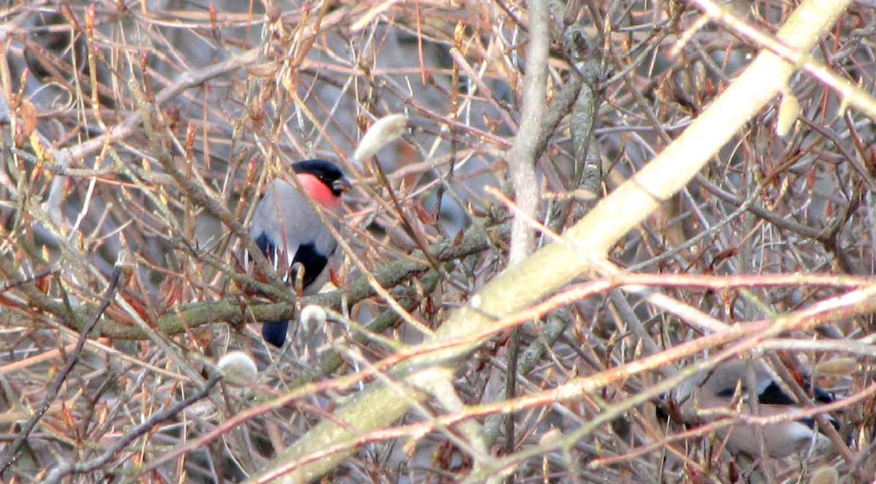 これまでは、桜の木やクヌギの木の芽などの食事を確認してきましたが、今回は違います。2羽のオスと1羽のメスで、ミツバツツジの花芽を啄ばんでいるのです。落葉低木だから、枝被りは致し方ありませんが、バックが空ではないので綺麗な色が出るでしょう。