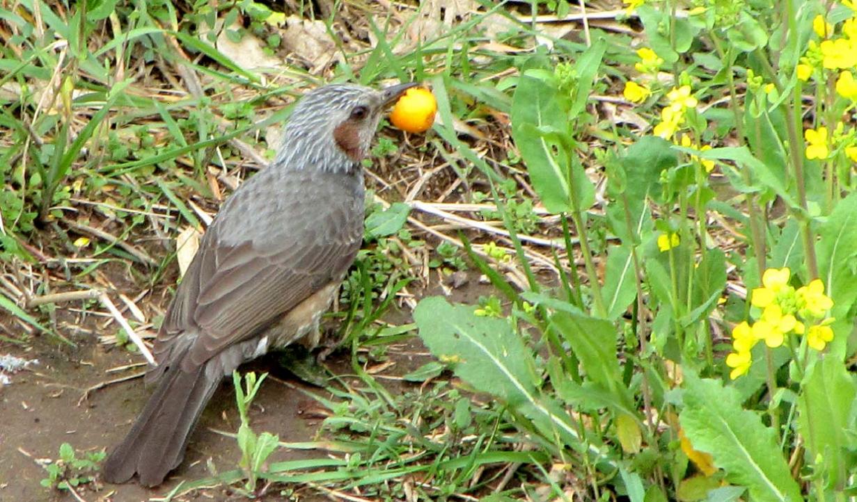 ヒヨドリが菜の花で遊んでいる様に見えたけど金柑です