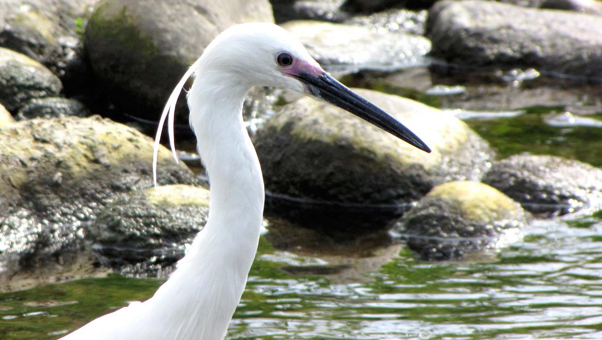 ダイサギは目と嘴の間が黒かったのが緑色、黄色い足がピンク色。コサギは、目と嘴の間が黒かったのが、ピンク色になって後頭部の飾り羽が2本出ています。腹からお尻にかけて、レースのような細い毛がたくさん。