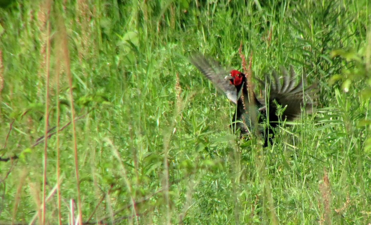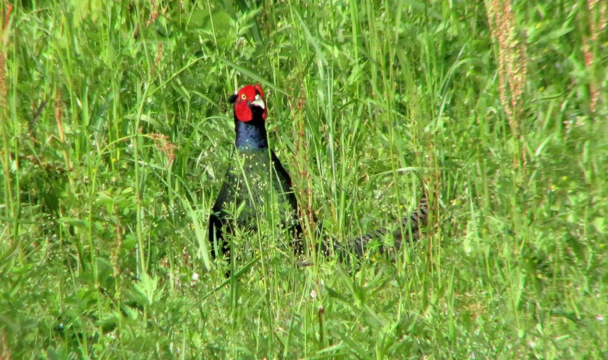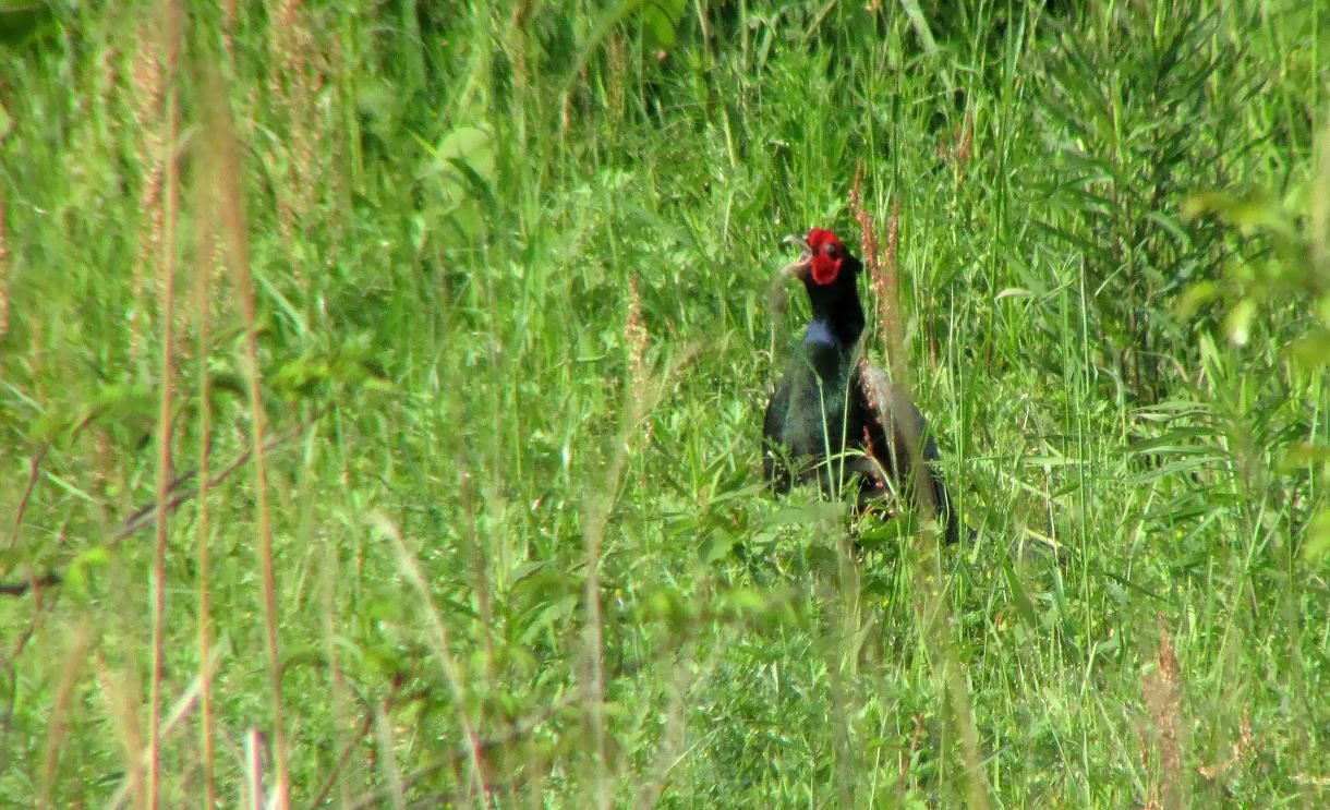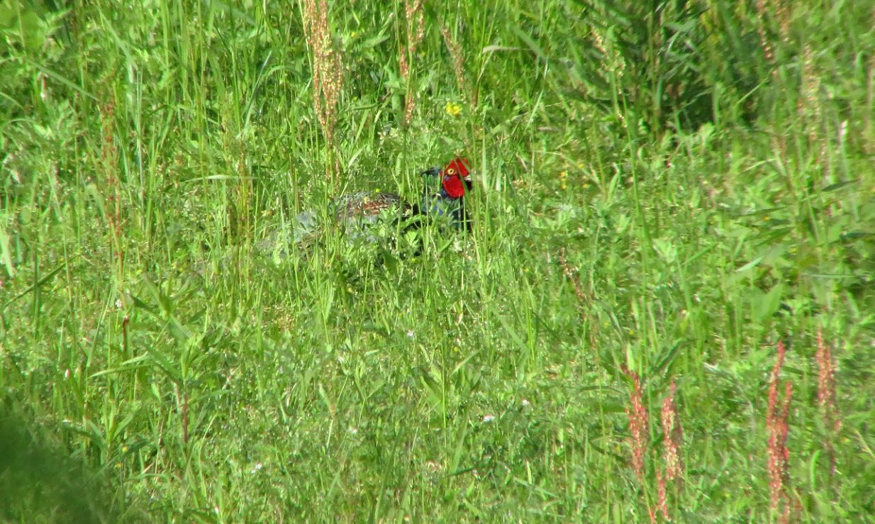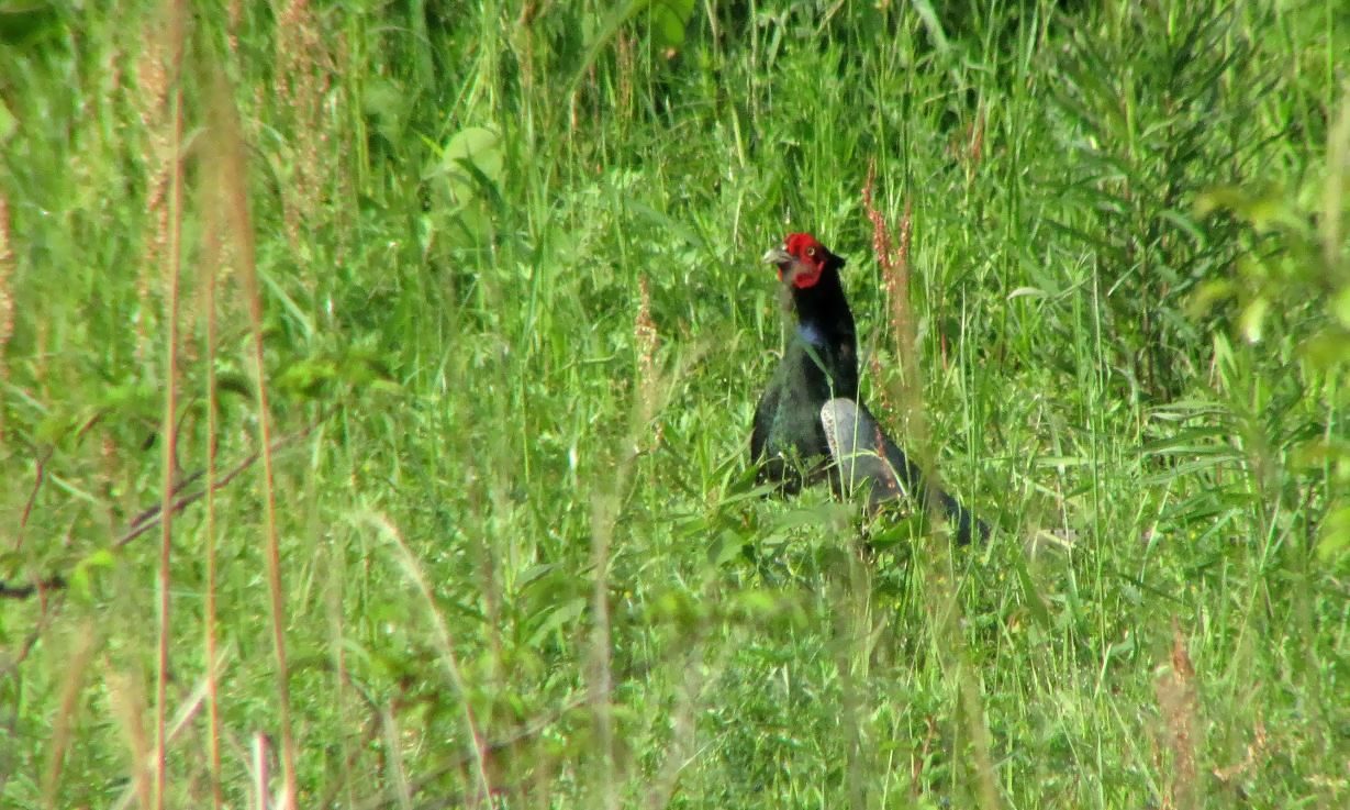 遠くの河原からキジの鳴く声が聞こえてきたので、ゆっくりと車を進めながらキジを探します。70~80m先で黒っぽい物体が草葉の間でチラリと見えました。