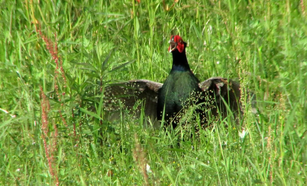 キジがケーン・ケン・・・と鳴く時には翼を羽ばたかせます。その勢いは、羽ばたく力で後ろにひっくり返るほどです。馴れたキジは長い尻尾で、後ろに来る自分の体重を支えて鳴くほどです。