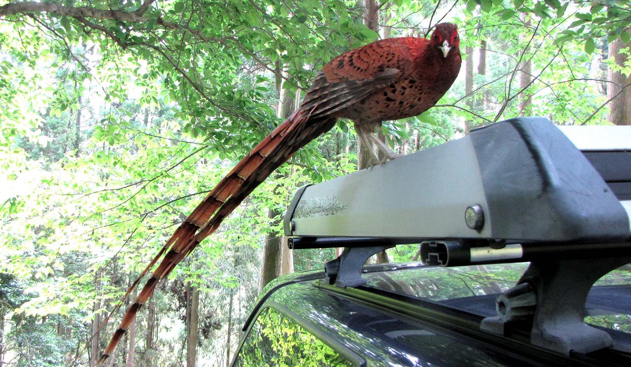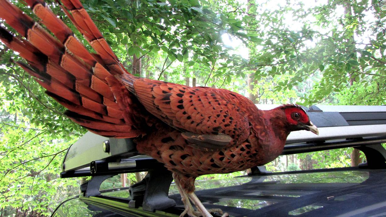 ヤマドリとの戦いに敗れ?カメラのバッテリーも切れたので、車に戻ってバッテリーを交換します。彼が居た所に目をやると姿が見えません。勝ち誇って山へ戻ったかと思いきや・・・
