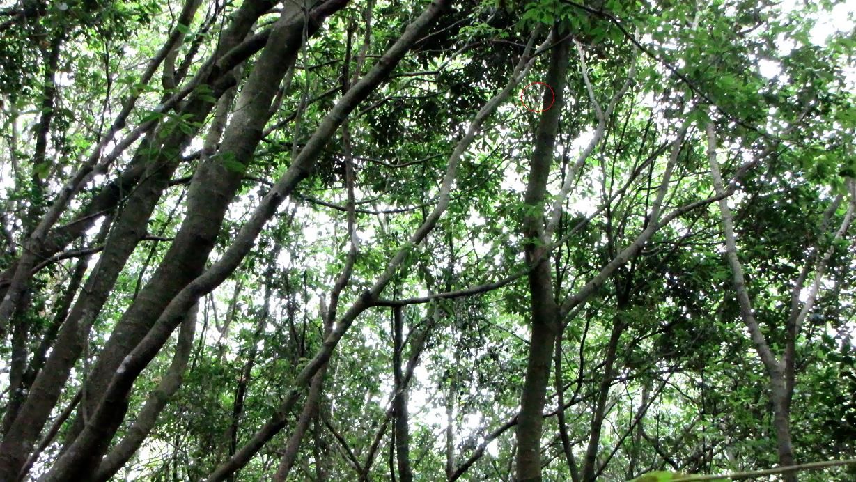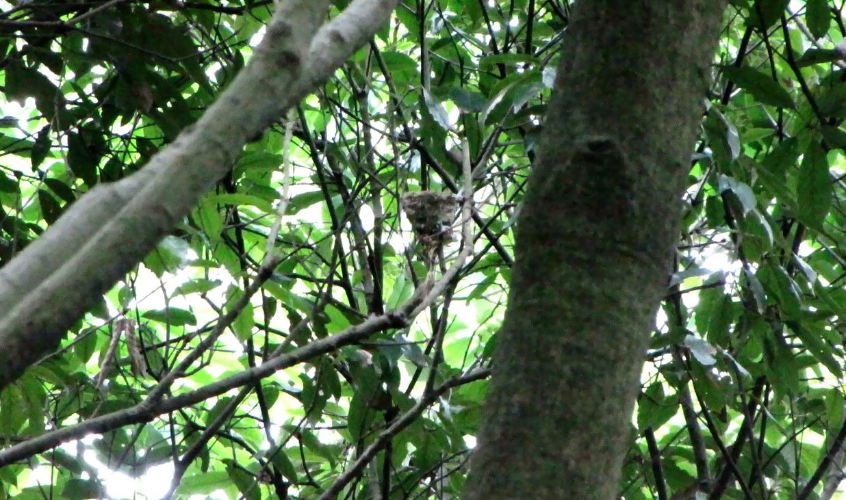 その後10分くらいで、メスのサンコウチョウが巣の方へと、私の目を案内してくれました。25~30mほど離れた木の元に私は居ます。証拠写真を撮っていたら、私に気付いたメスのサンコウチョウが巣から出て、直ぐ傍にやってきました。