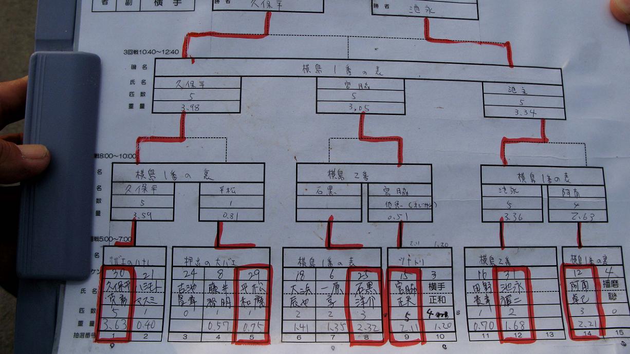 勝因はマキエと仕掛けの投入タイミング。見ていた皆さんは分かったでしょうね。ちなみに今回使ったムキミは、大会前に岩崎君から頂いたもので、喰い込みが抜群に良かったです。本人は4位で不本意だったらしいけど・・・。