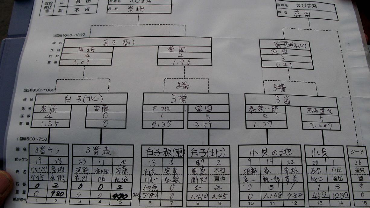 今回の私は一回戦・二回戦・三回戦を戦って、千代丸の2位通過で決勝戦に出る事が出来ました。ちなみに一位通過の久保平君は、24歳の若さで抜群の釣技を見せての勝ち上がり。えびす丸からは、名人位を獲得している有田君と、急成長の岩崎君が勝ちあがり、4人で横島3番を舞台に決勝戦を戦ったのです。