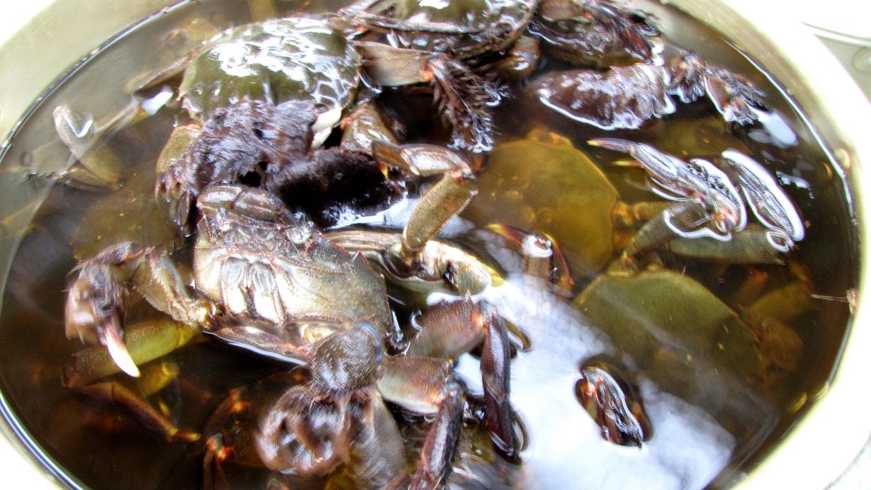 モクズガニがお風呂に入っています。大型のオスと小振りなメスは半々