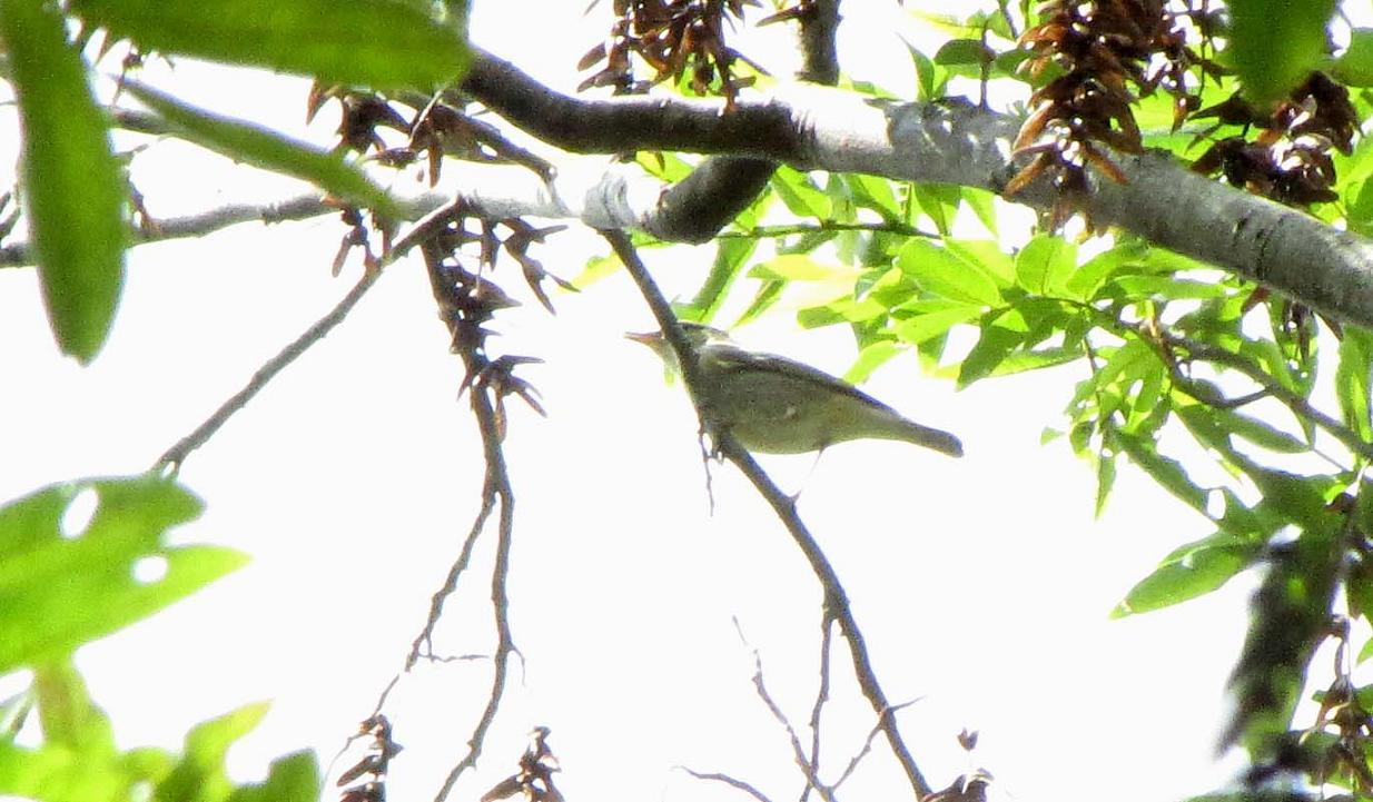 声の方を仲間からプレゼントされた双眼鏡で確認していると、ウグイスに似た小鳥が、サワグルミの大木の上で動き回っています。眉班が見えます。鶯と色や形も似ていますが、尻尾が短くウグイスではありません。この時は鳴かなかったのですが、ムシクイの仲間の地鳴きだと判断していました。