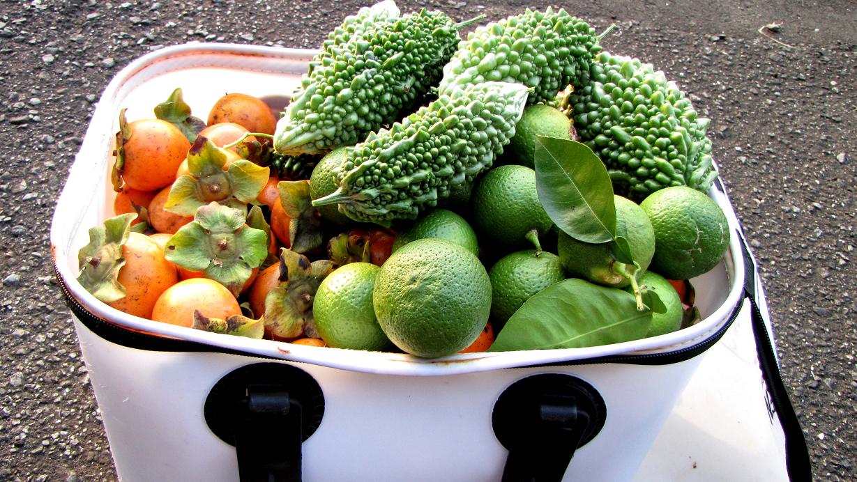 この柿はとても小さく、カボスと同じくらいです。昔ながらの甘味で流行の柿たちとは趣を異にしています。苦瓜は最後の実が少し付いていました。