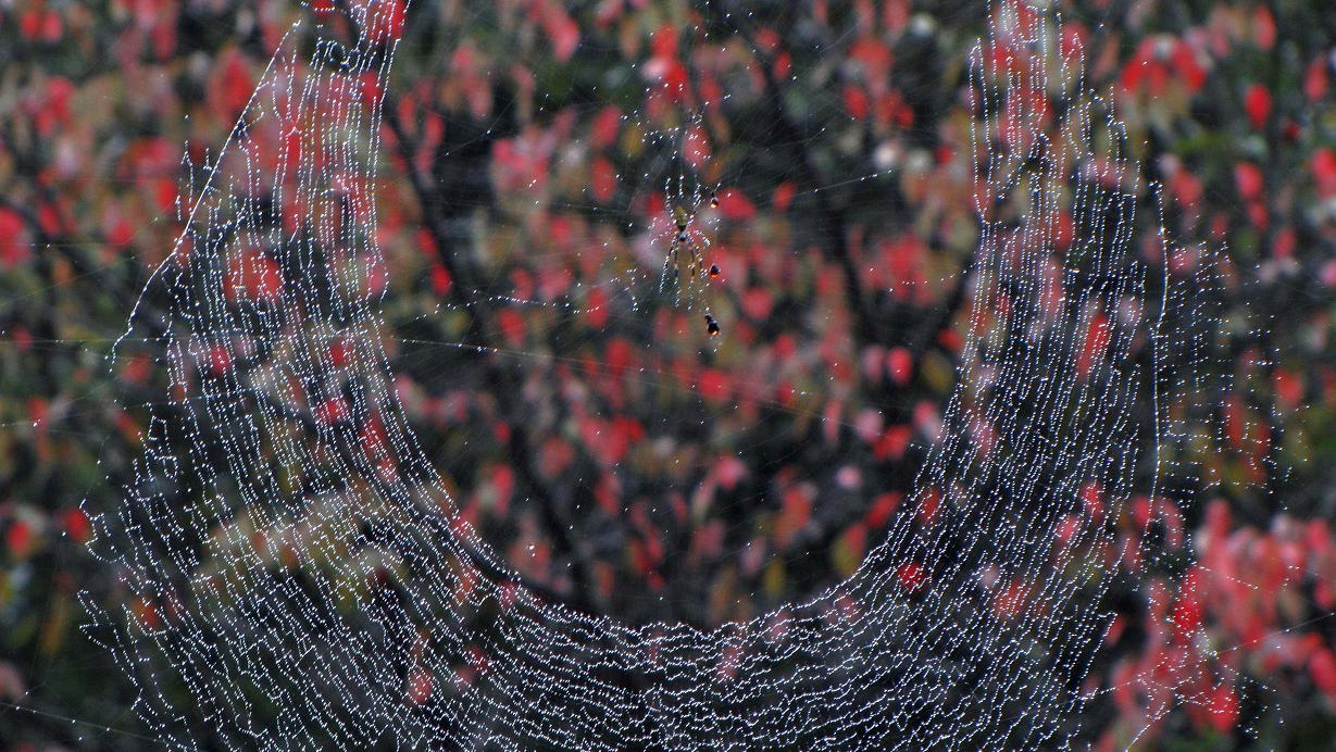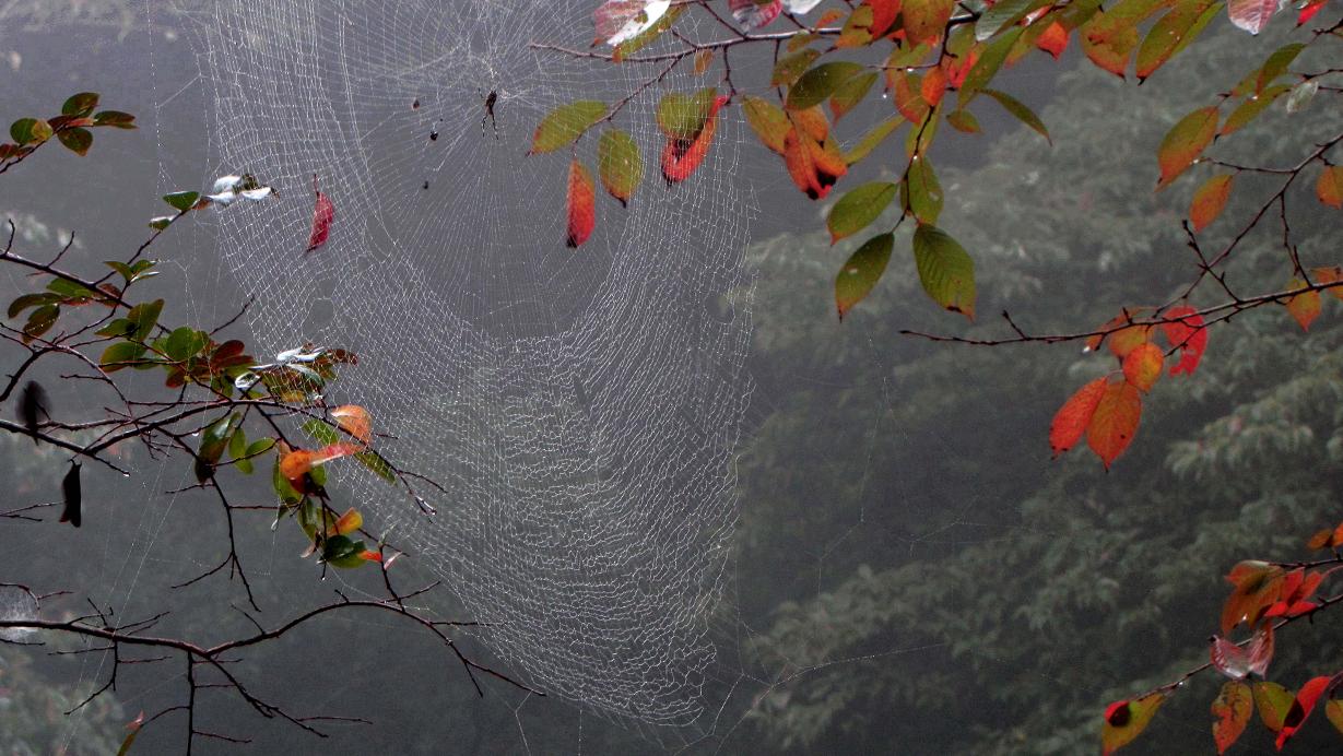 ジョロウグモの一種が雨の中ジッとしています