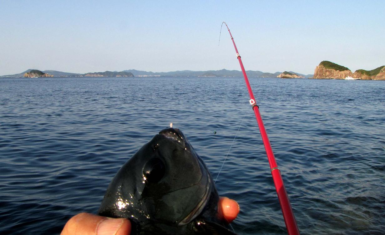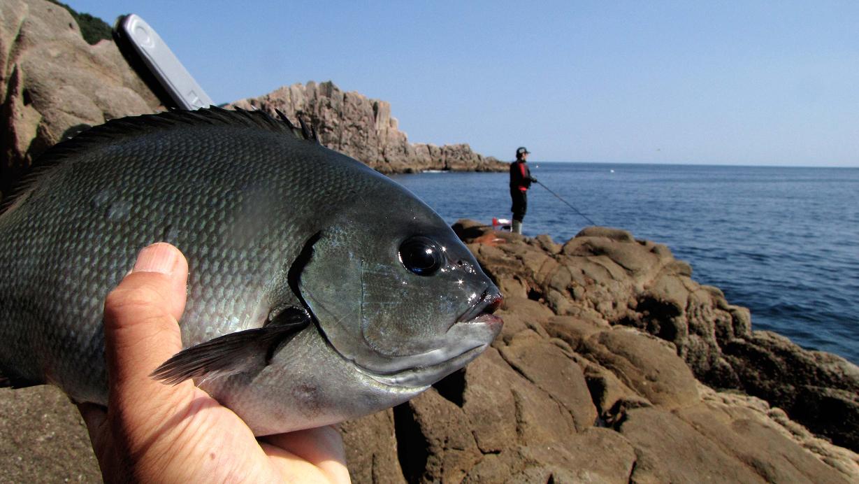 二回戦は大小瀬本島のワンドより西側部分に上礁、2名で3時間の対戦です。なかなか釣れませんでしたが、磯際狙いで1匹のグレ、場所交替後は遠投してオナガを1枚追加する事が出来ました。