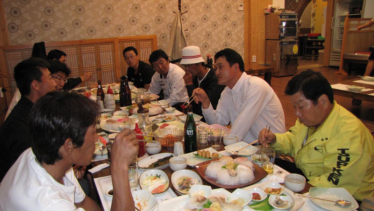 コリアオープンカップチヌの開会式が終了後、モーテルにチェックイン。その後、初日の夕食に行きました。韓国の釣研FGチームや前回の優勝チームなど、関係者の方々と美味しい料理を食べながら談笑です。