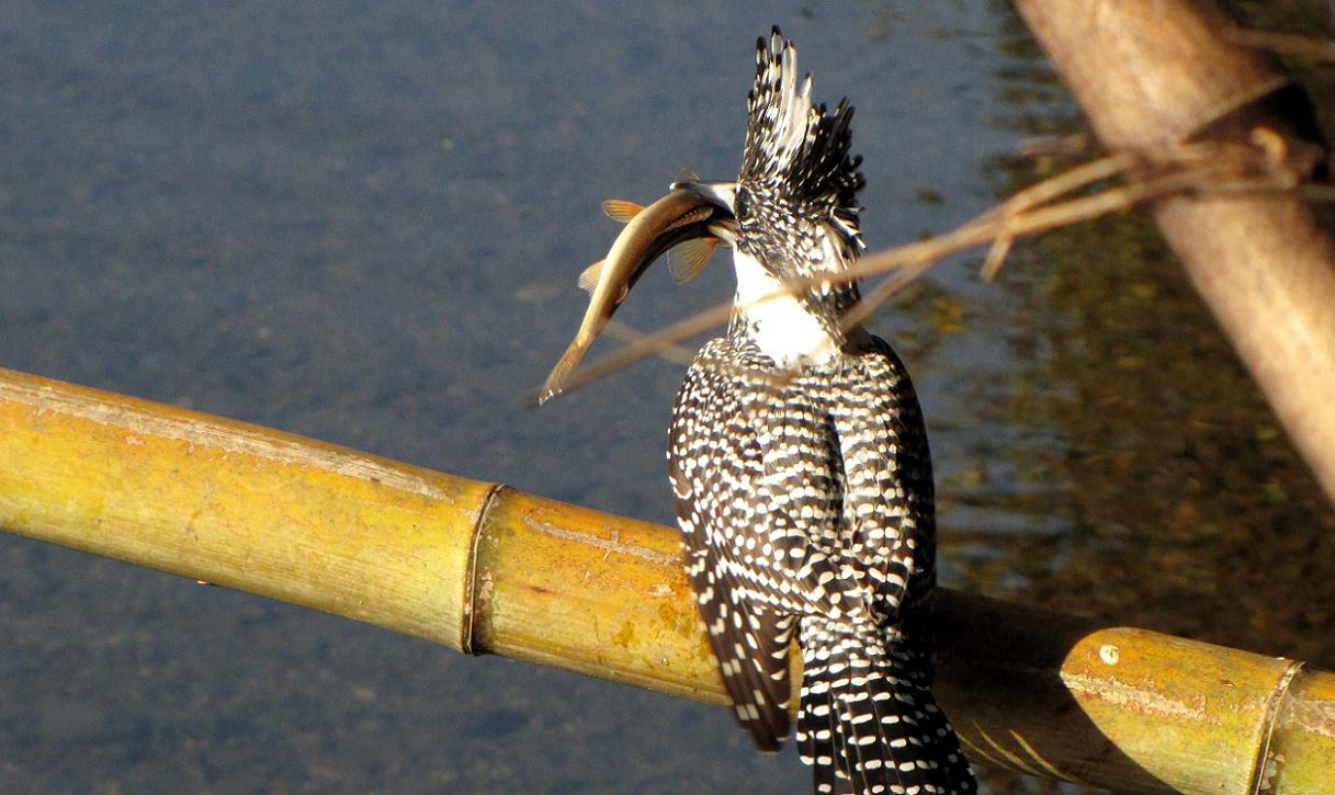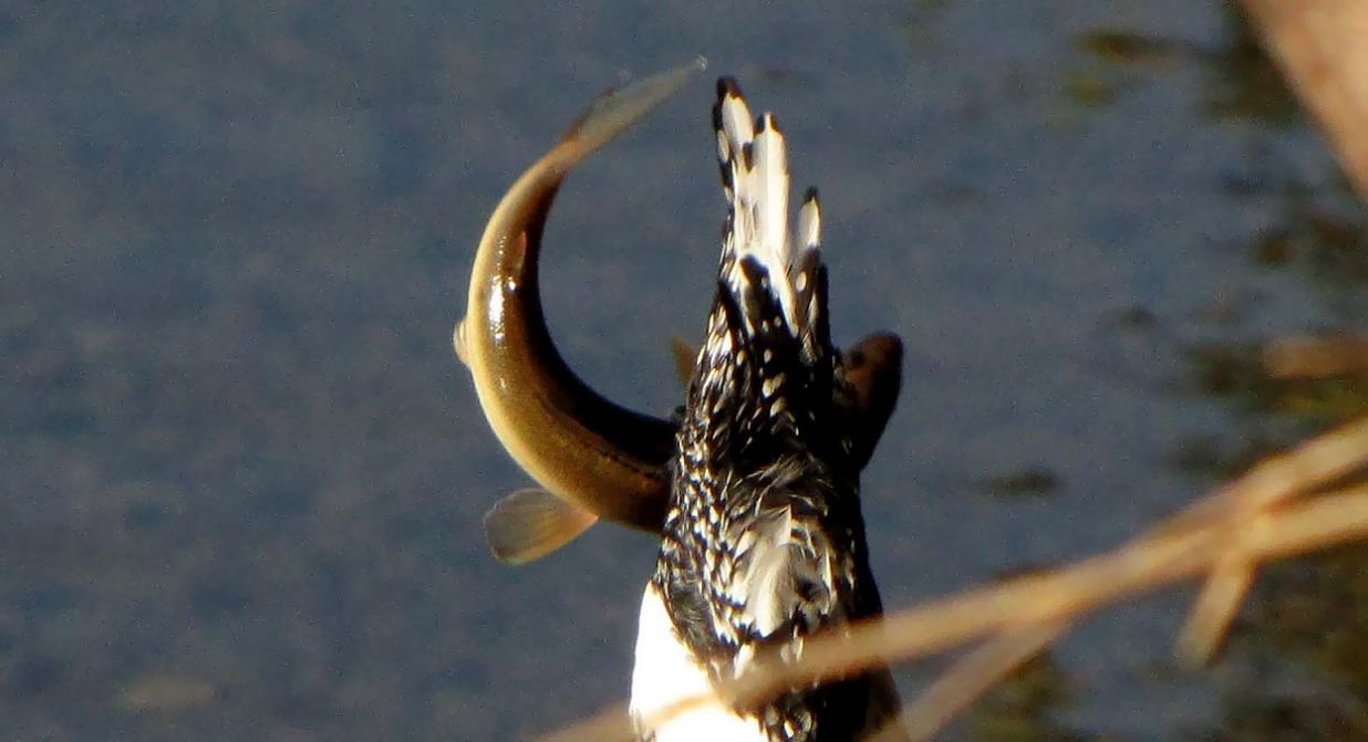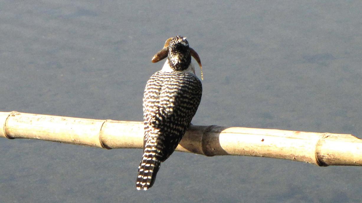 下流でダイビングして、竹の元側に留まるかと構えたら、中間部分に留まって、口にはカマツカを咥えていました。このカマツカは直ぐに呑み込んでしまいました。次は上流側へ行ってダイビングしたので、カメラを中間部分に構えて待ったら、今度は竹の元側に飛んできて、クルリと上流へ向いたその口に、撮りたかったアユを咥えていました。