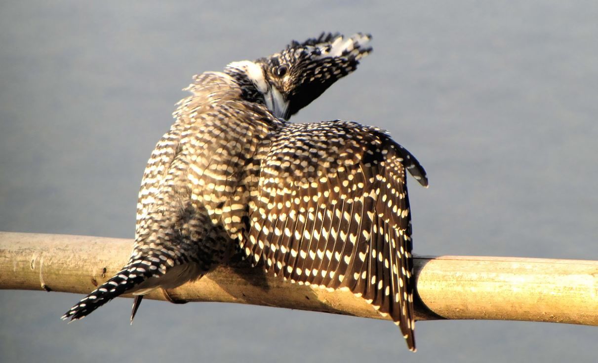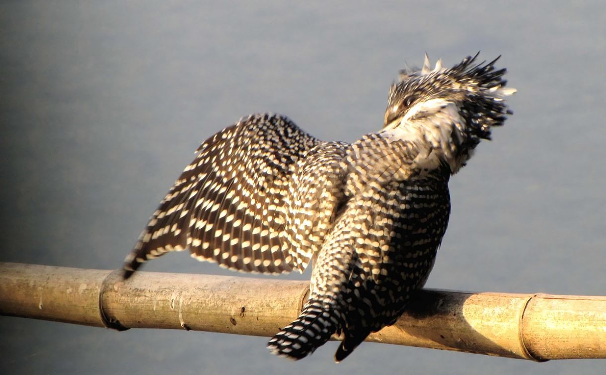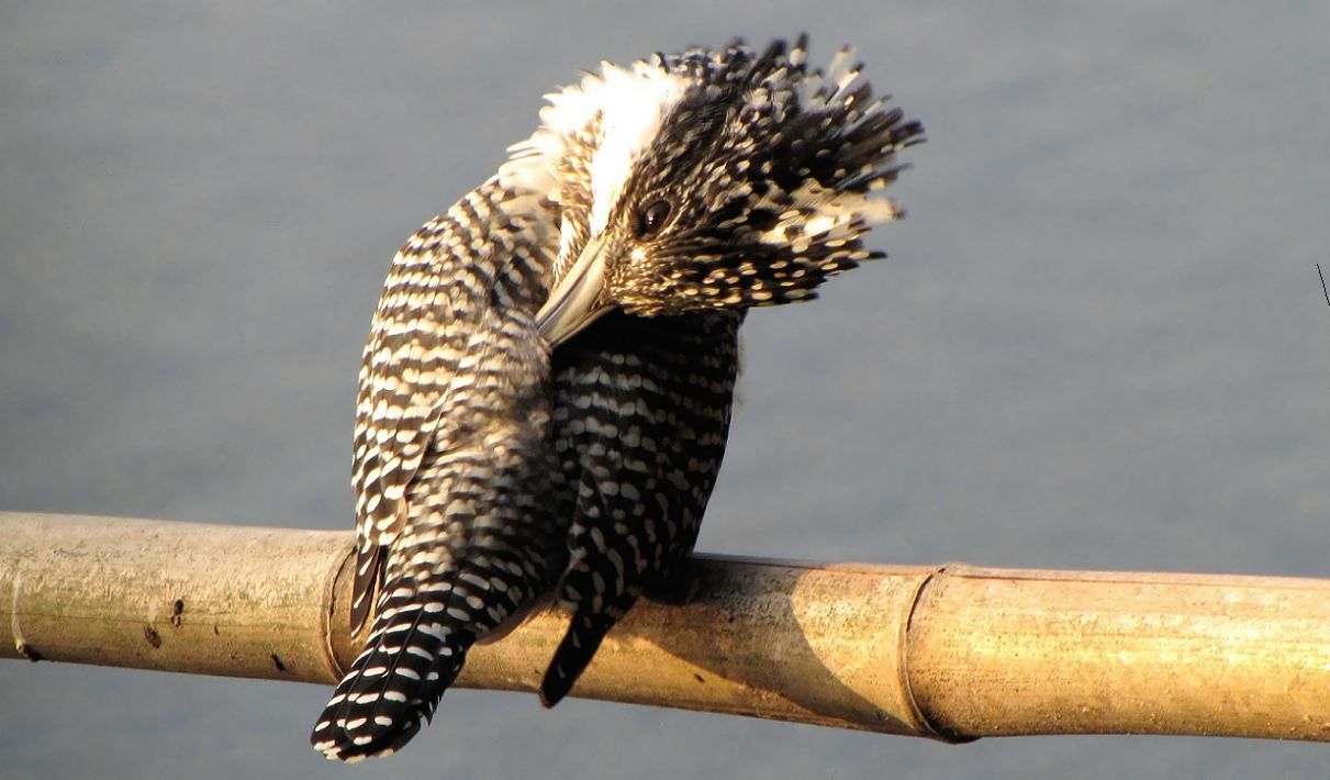 綺麗なヤマセミのメスが羽繕いを始めました。
