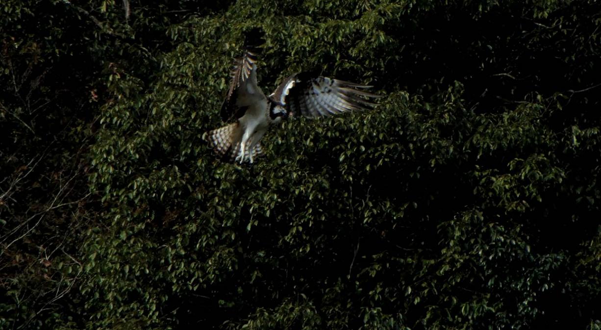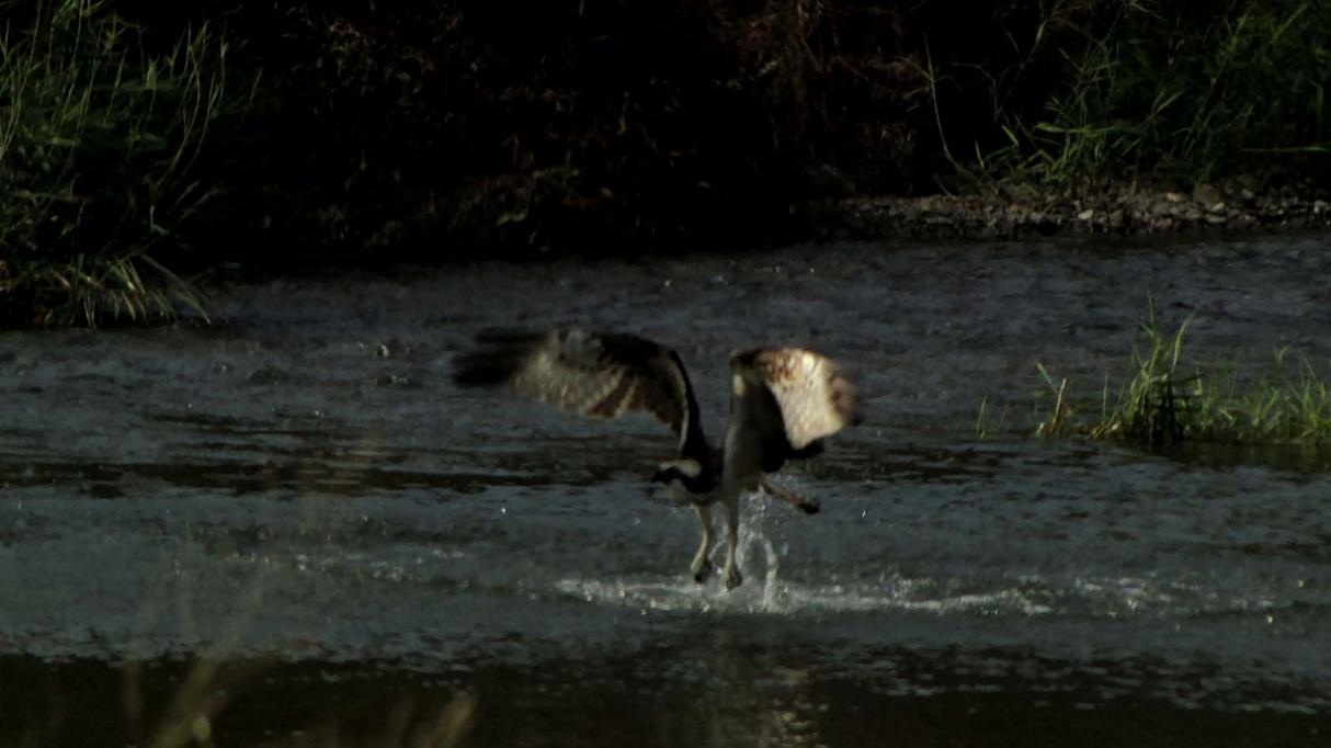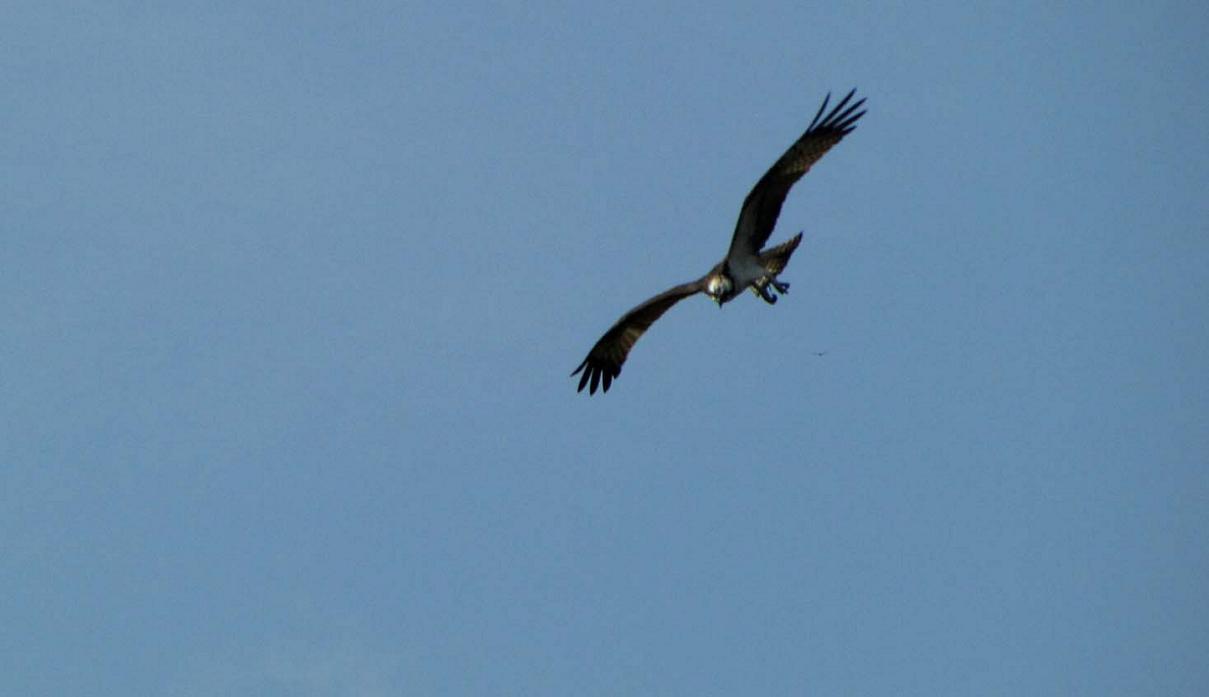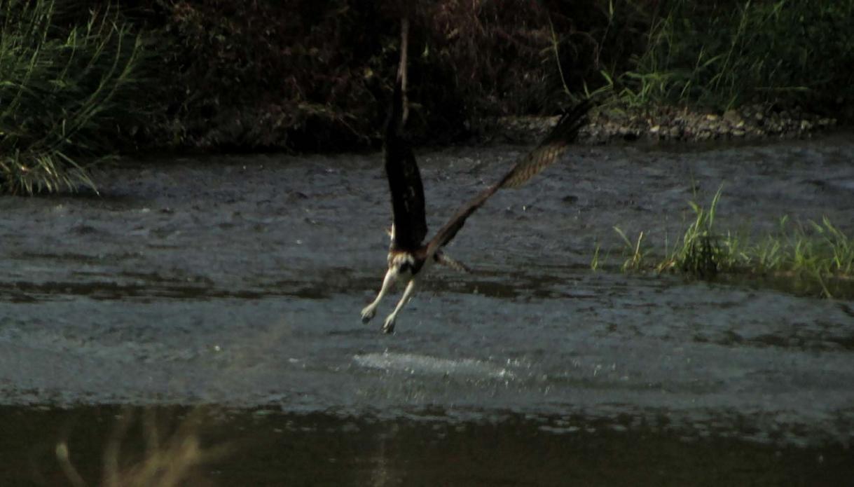 ミサゴは獲物を見つけ、ミサゴ席から上空に舞い上がりホバリングの後、川へダイビングしましたが失敗。そのまま上空へ舞い上がり、再びホバリングして、私の車から20mくらいの川面に急降下でダイビング。またも失敗です。
