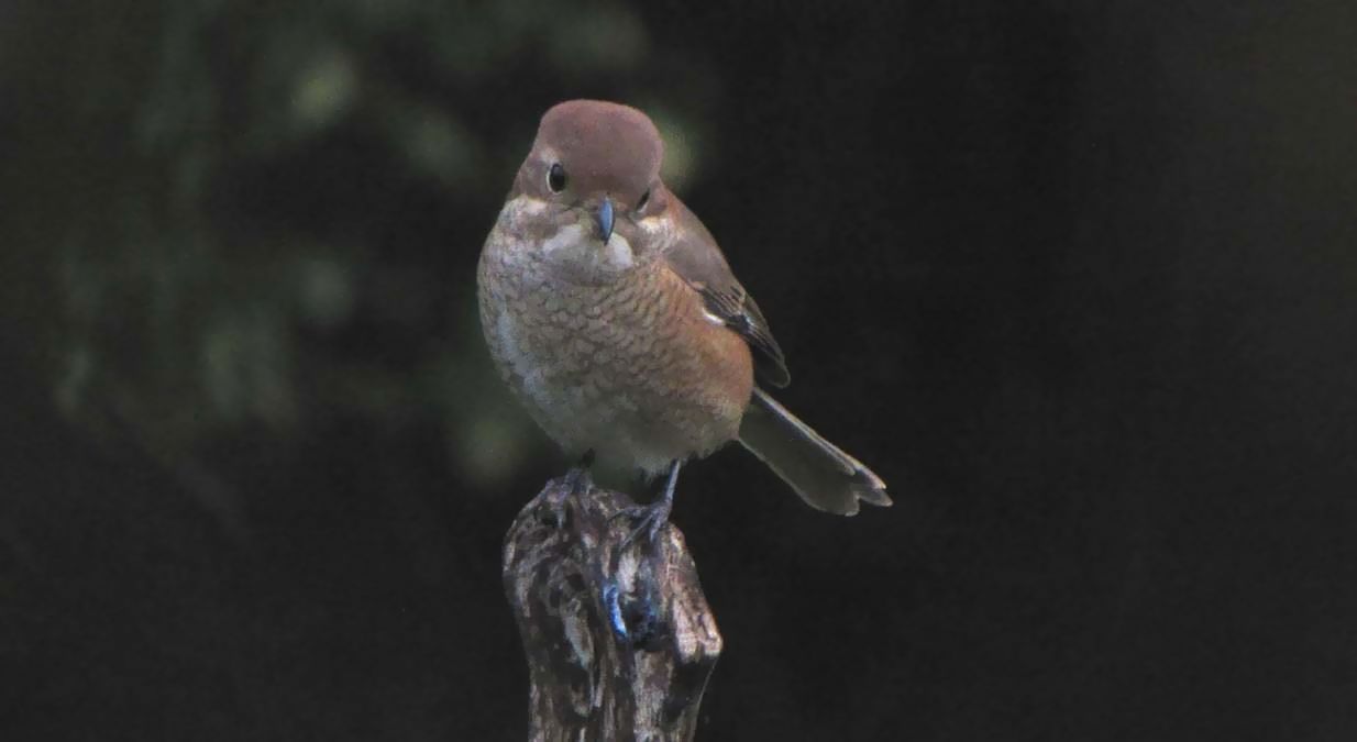 七瀬川右岸の鳥見基地から、ジョウビタキのメスが利用する止り木に、一時的に留まったモズのメスをコンデジで写しました。・・・11月16日の出来事です。