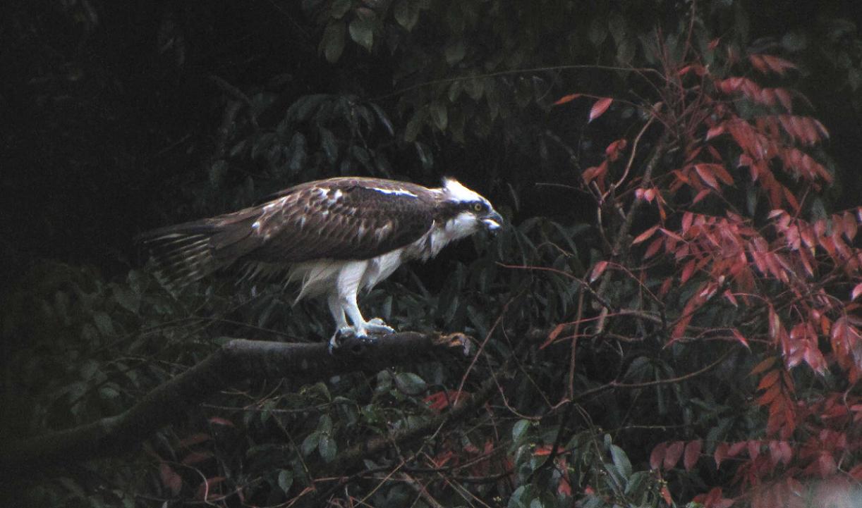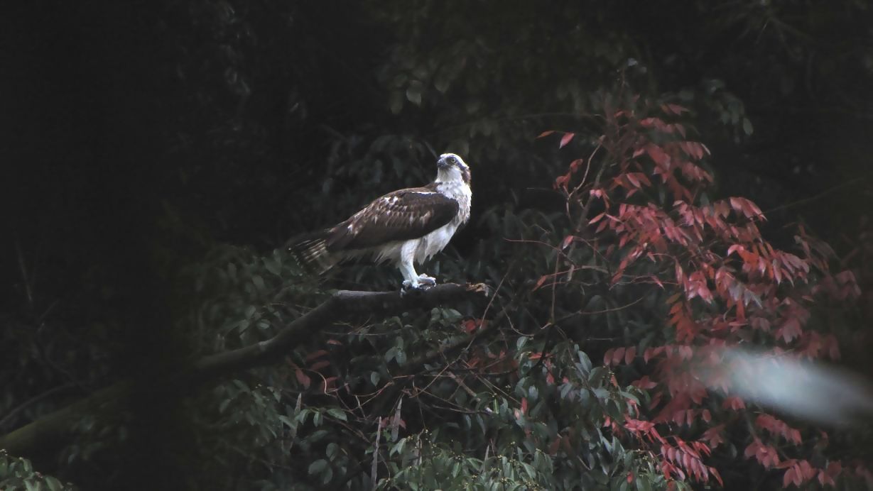 ミサゴが獲物を捕らえてミサゴ席に留まりました。食事場として使っている所を初めて確認出来たのです。車から降りて上流側へと歩いて行き、彼から見えなくなった時点で、今度は下流側へと走って近づきます。