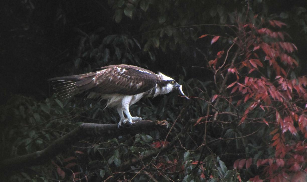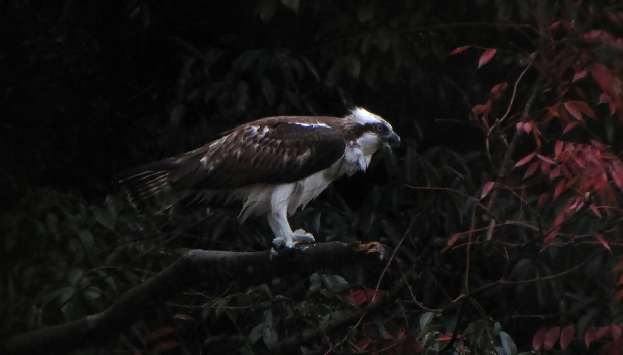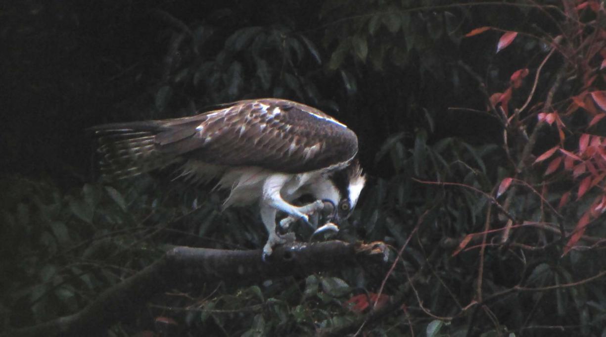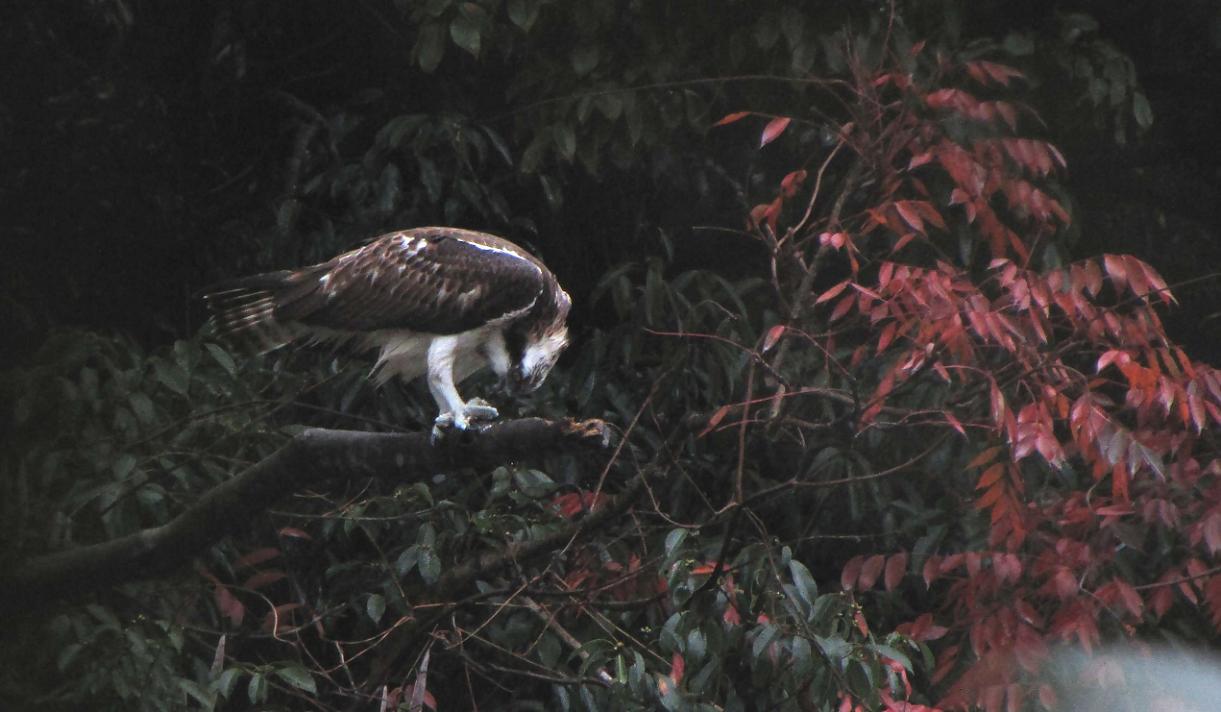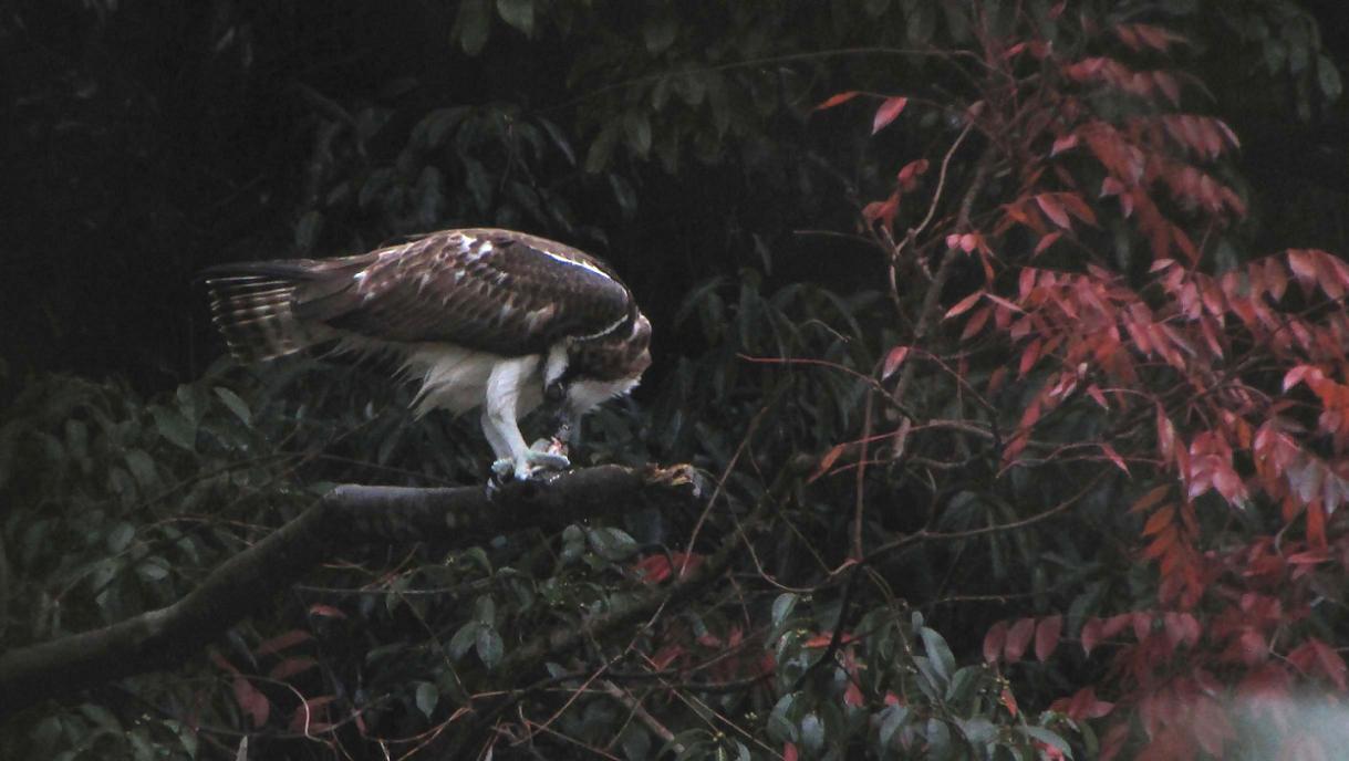 獲物が小さかったので、喰い終わっていると撮れないのでダッシュしたのですが、ミサゴはこちらに気付かず、一心不乱に食事をしていました。彼との距離は約30m、食事が終わるまで竹林からシャッターを押し続けました。