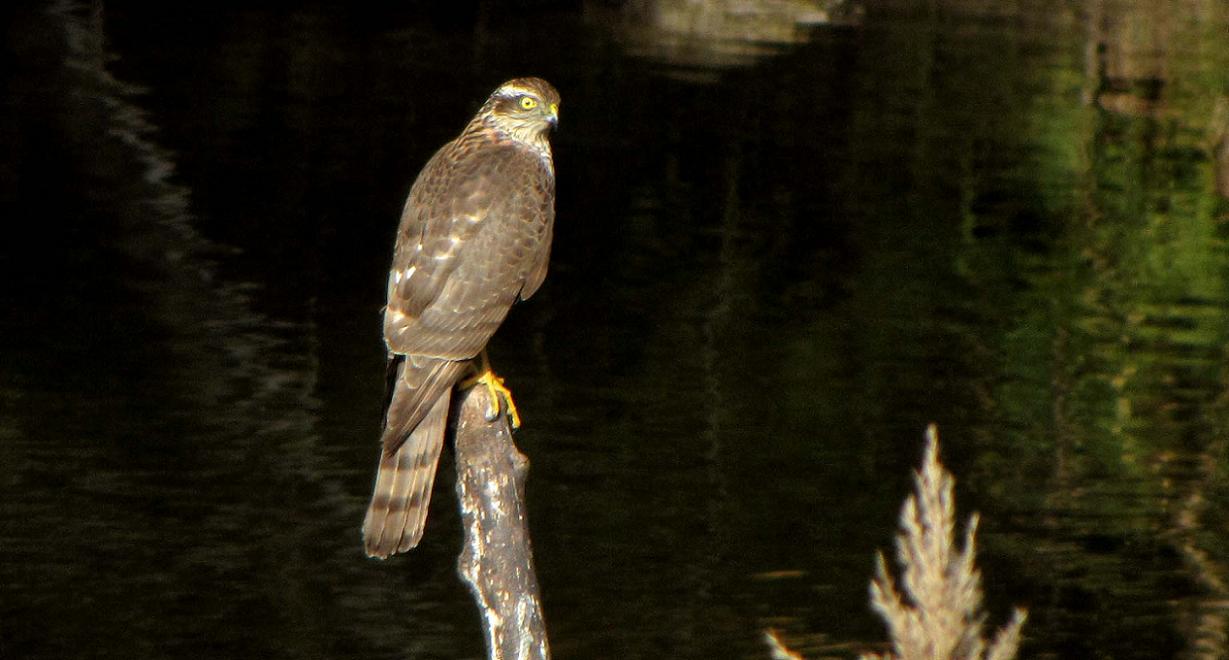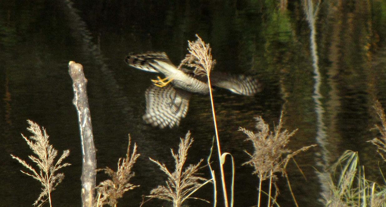 本部基地の前で、カワセミ用に立てていた杭を、5mほど下流側へ移動させたら、この杭にハイタカのメスが留まってしまいました。ハイタカは水際へと舞い降りて獲物をキャッチ?見失いました。