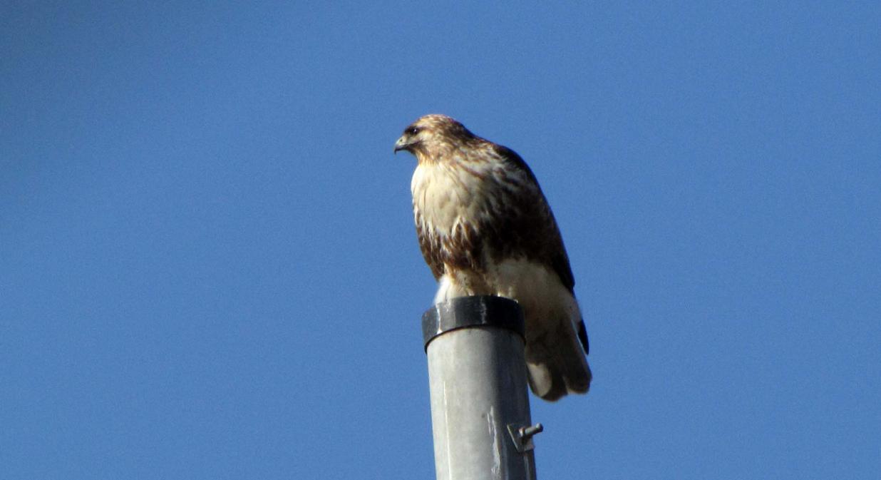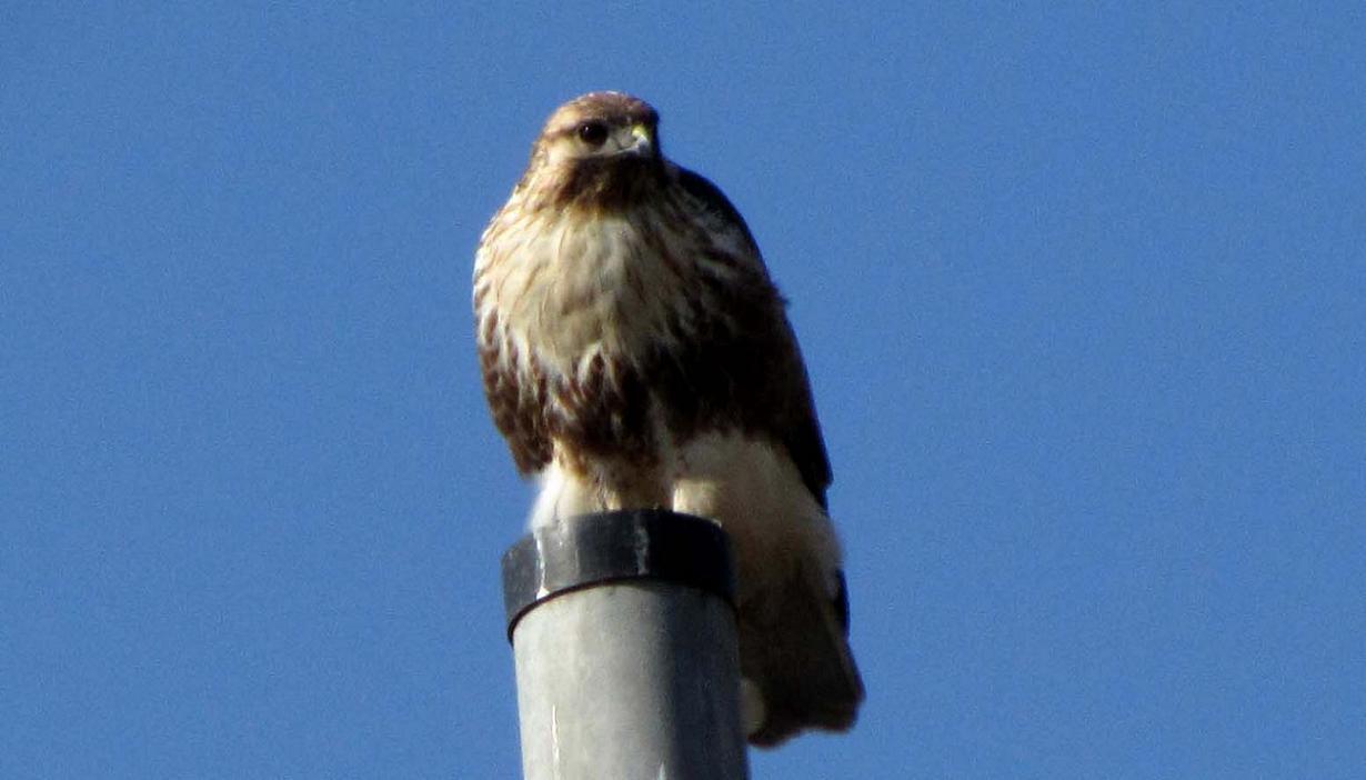 ノスリが飛んでいる姿を3度ほど確認しましたが、狙いの電柱にはやって来ません。確認している電柱は右横から右前方にかけてと、左後方の数本でした。留まってくれたのは左後方の電柱で、見上げる方向です。