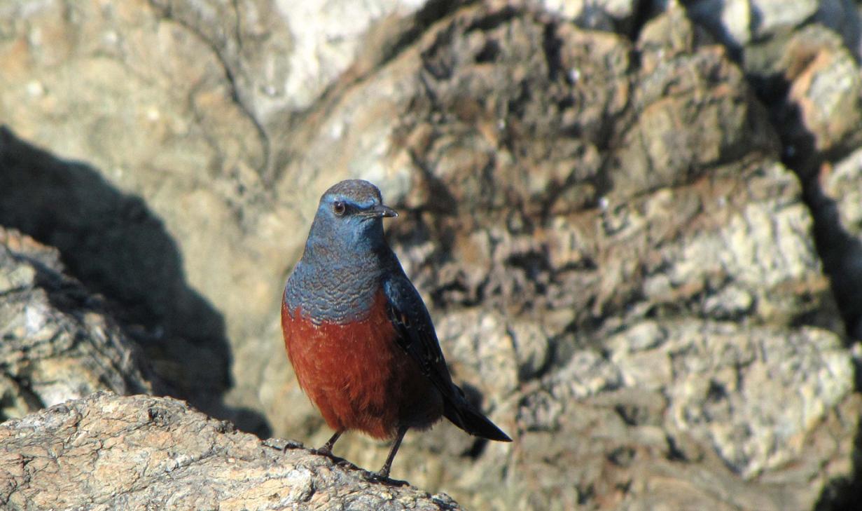 地の観音でのお客様、イソヒヨドリのオスがオキアミを食べに来ます