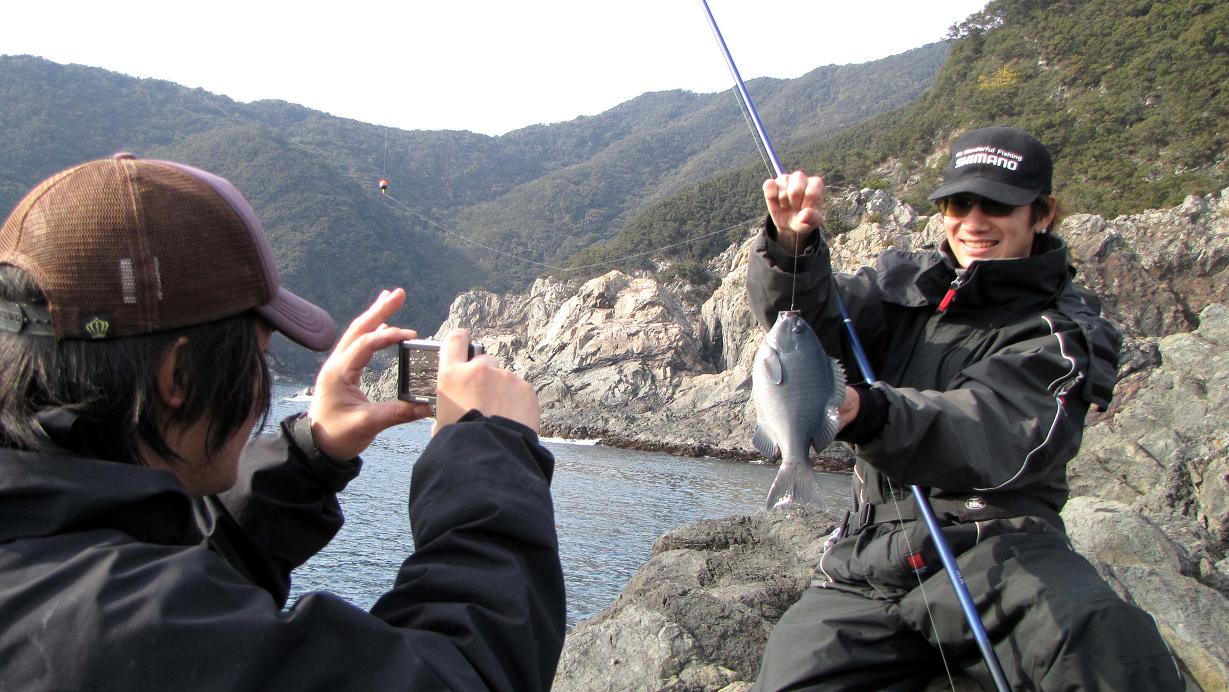 バラシの後、キープサイズのグレを持つ古家君。手前は源君