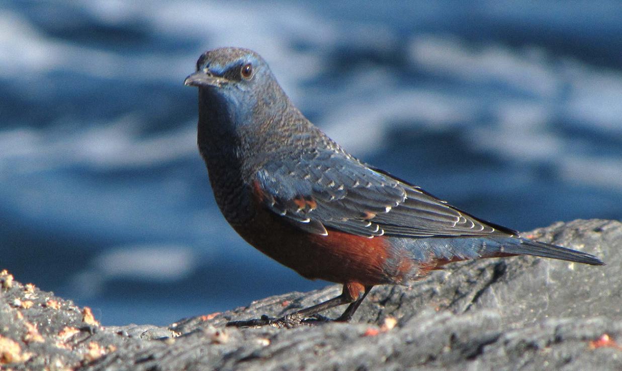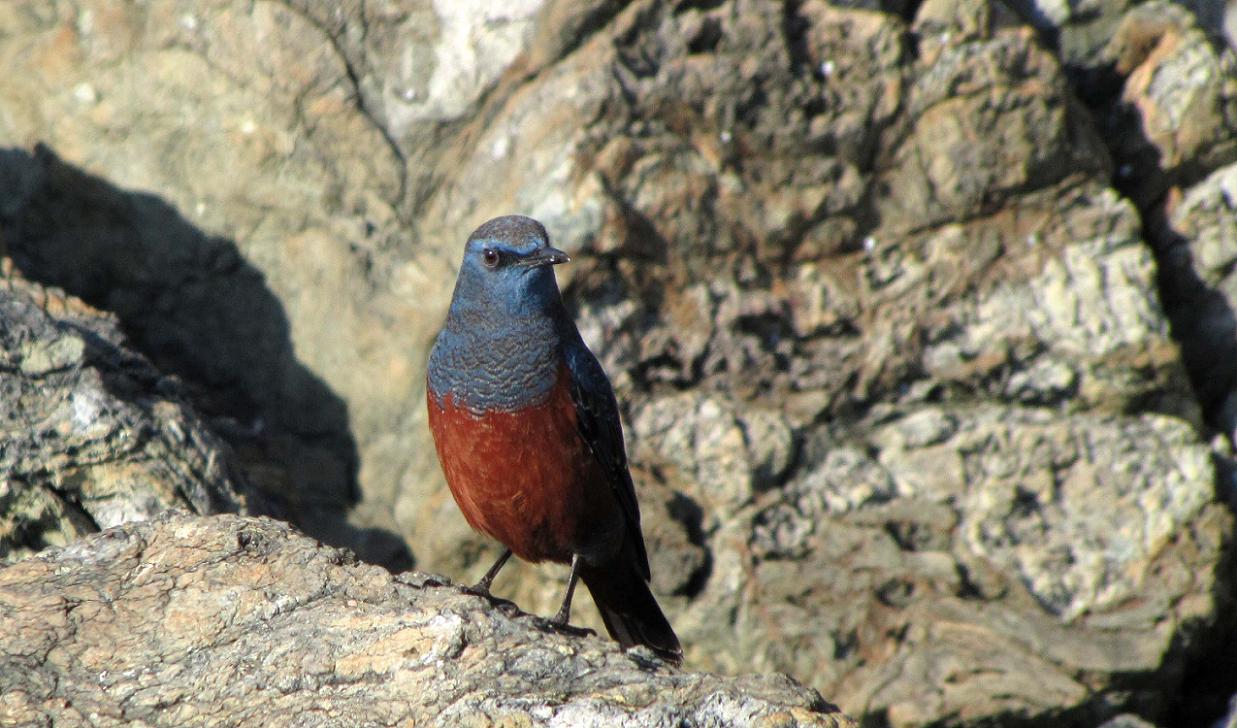 イソヒヨドリは留鳥だから一年中見ることが出来ます。特に海岸線の岩場に多いのですが、群れる事はなく、オスもメスも単独行動している事が多いです。街の湾岸でも見られるし、私は山間部の竹田市でもオスのイソヒヨドリを見ています。大野川伝いに、山の方まで移動しながら住み着いたのでしょうね。