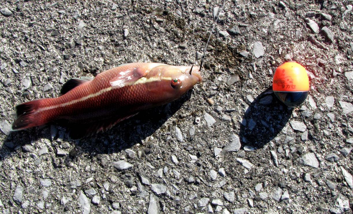 この魚が最初に釣れた後、白灯台側ではアタリがなくなってしまい、一投毎にサシエのアオイソメは盗られてしまいます。半分のマキエを使った後は、地磯側へと場所移動をしました。