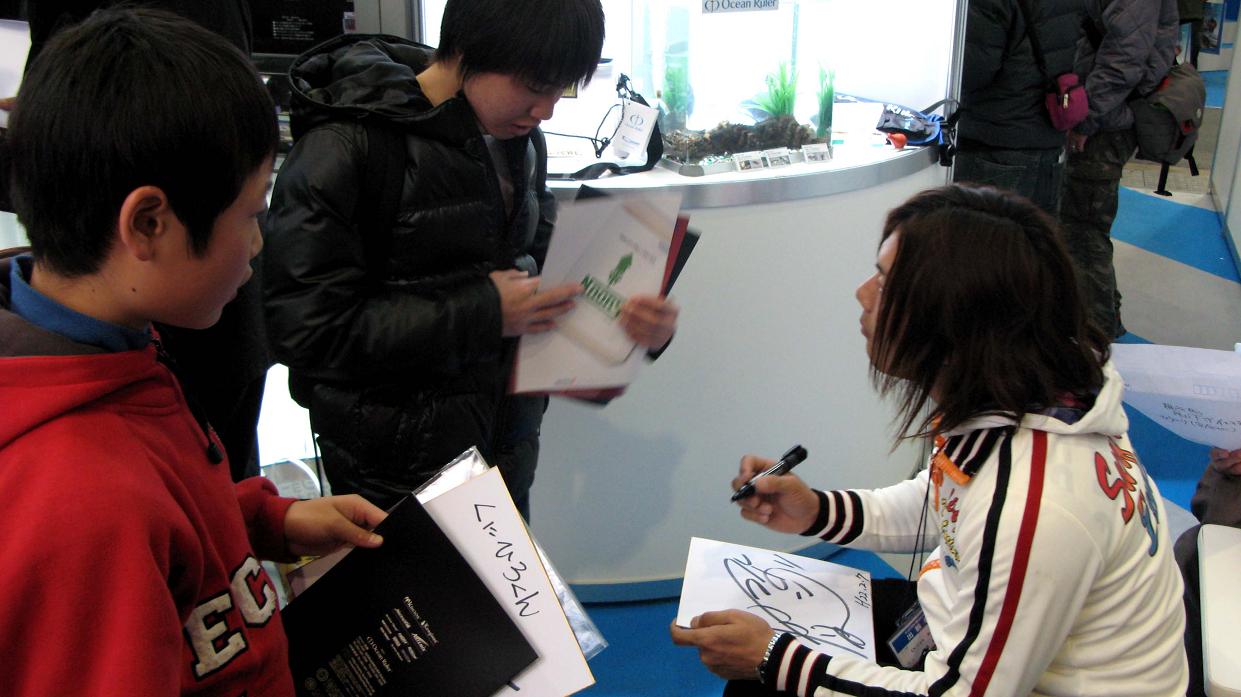 釣研は今年も新作が盛り沢山。オーシャンルーラーも、TVなどでおなじみの、金丸名人が人気を博していました。彼はヒューマンアカデミー福岡校の卒業生で、7年前に私が講師として勤め始めた時、2年生の後期授業で受け持った学生でもあるのです。彼は同期生№1の成績で卒業した実力者です。