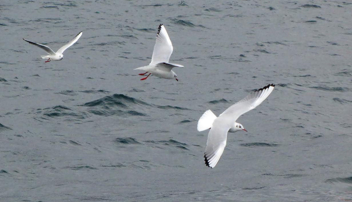 そのユリカモメを写していたら、一羽だけ直ぐ近くに舞い降りて、落ちているオキアミなどを食べています。でも右脚にはハリスが絡んでおり、上手く歩けません。