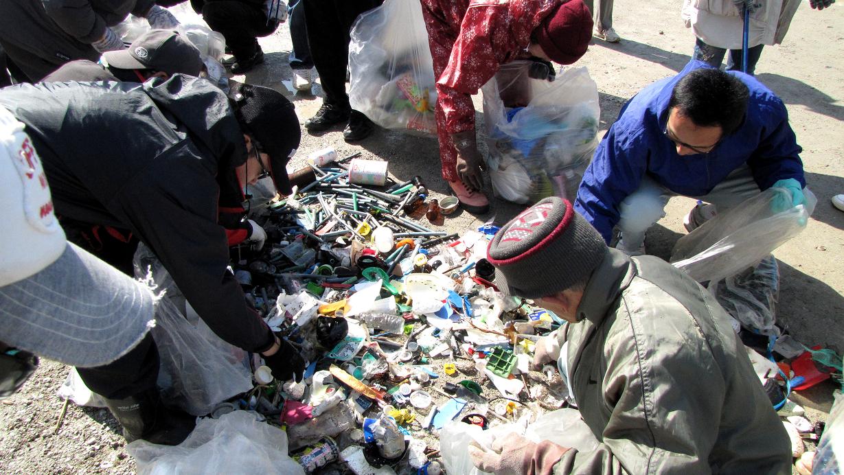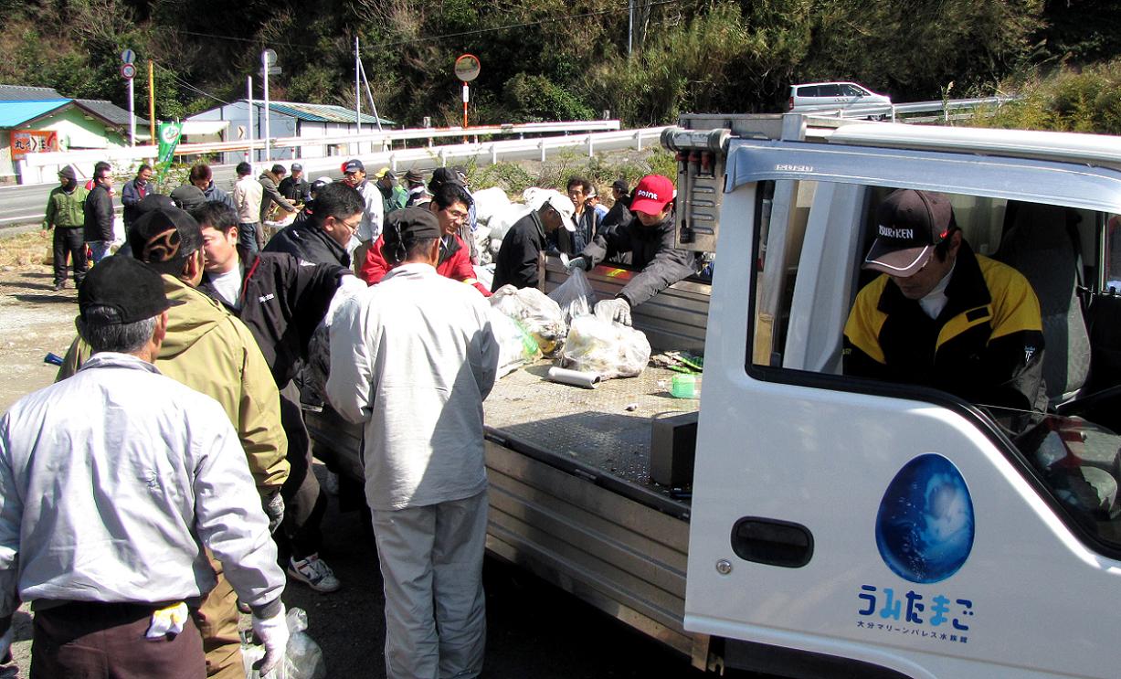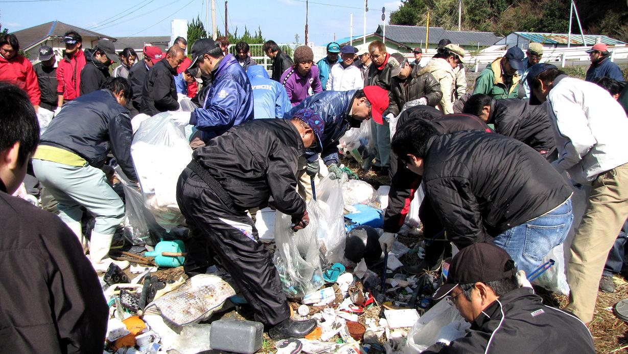 集めたゴミは全て袋から出し、津久見市の分別に従って7つの種類に分ける作業をしました。9時集合12時解散の工程です。今回はチリの大地震で、午後に津波警報が出ており、安全を考慮しての作業でした。