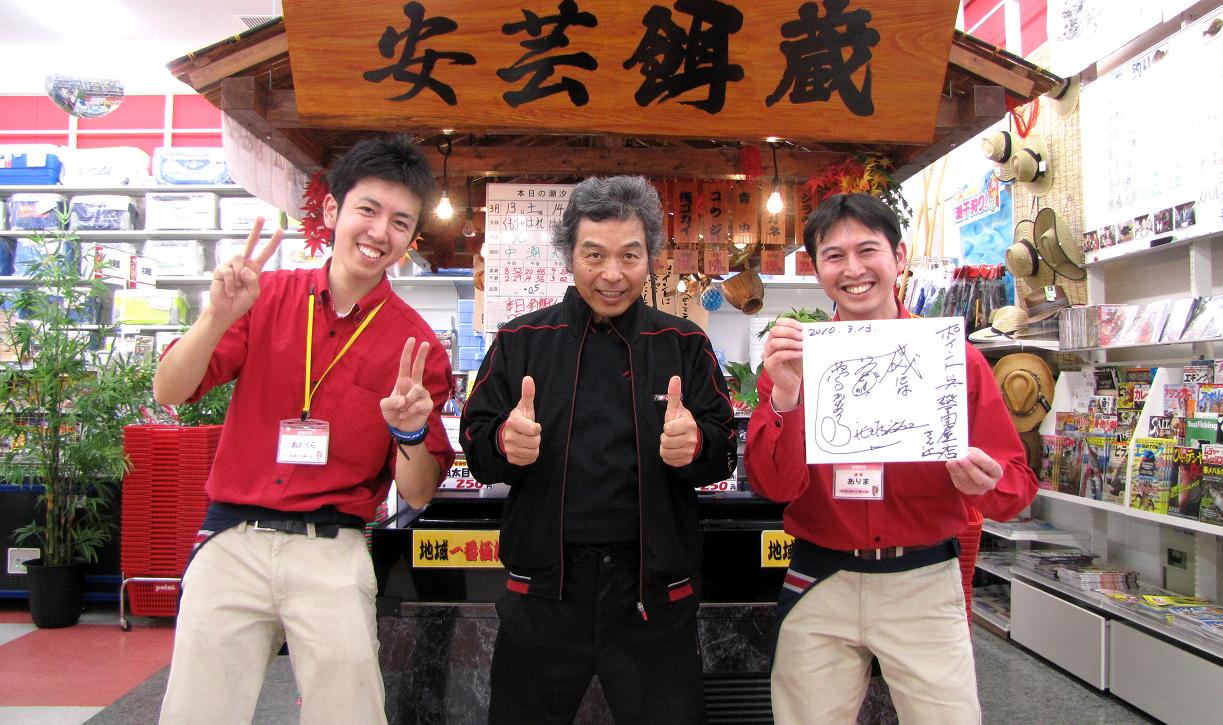 ・・・呉に“ポイント呉警固屋店”が出来て、そこで働いているスタッフに、ヒューマンアカデミー福岡校から来ている人が居るらしく、立ち寄りました。そのスタッフは昨年卒業した大倉君でした。教え子との嬉しい再会も果たす事が出来、有馬店長へは今回のカンダイ釣り写真など、情報として提供しました。