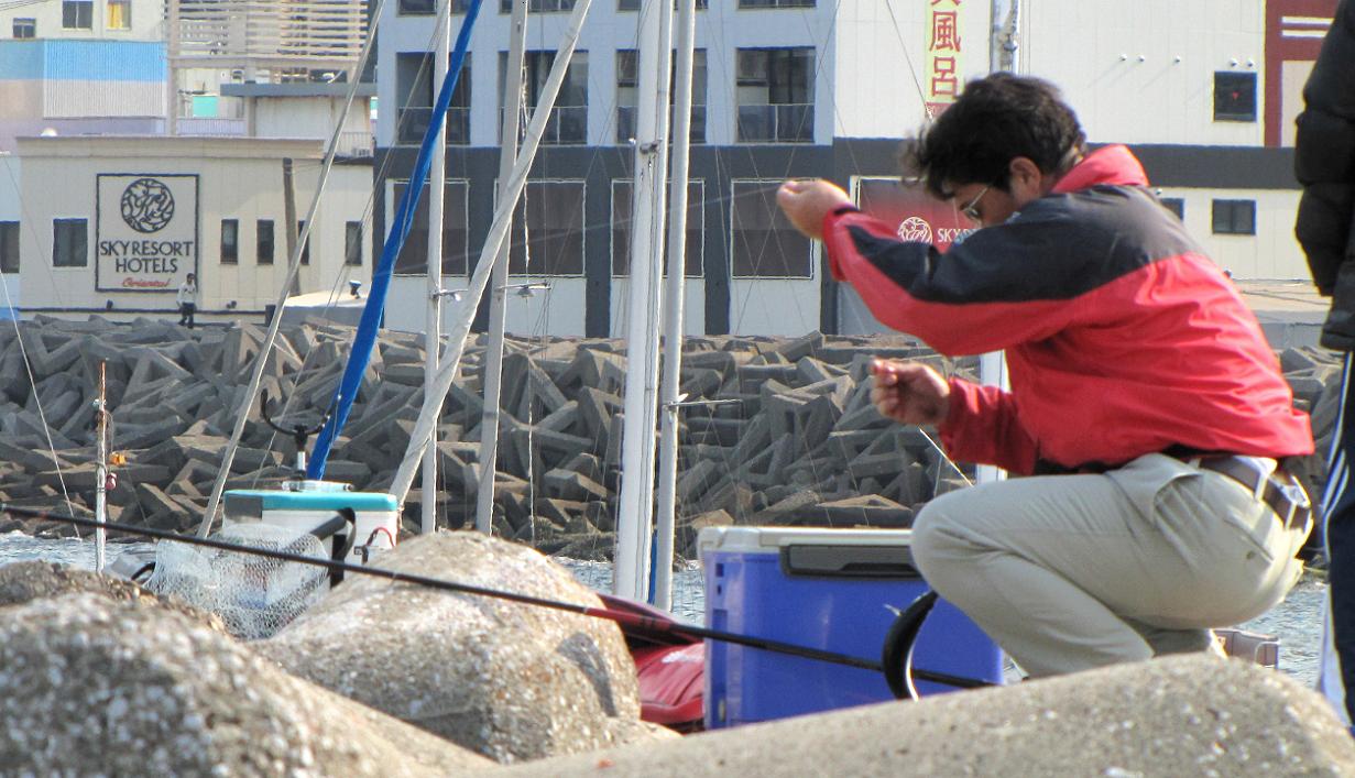 楠港で長尾君達とも合流し、消波ブロックに釣り座を構えました。午前中の釣り人が帰り始めていたので、5人でなんとかフカセ釣りを出来るスペースを確保。