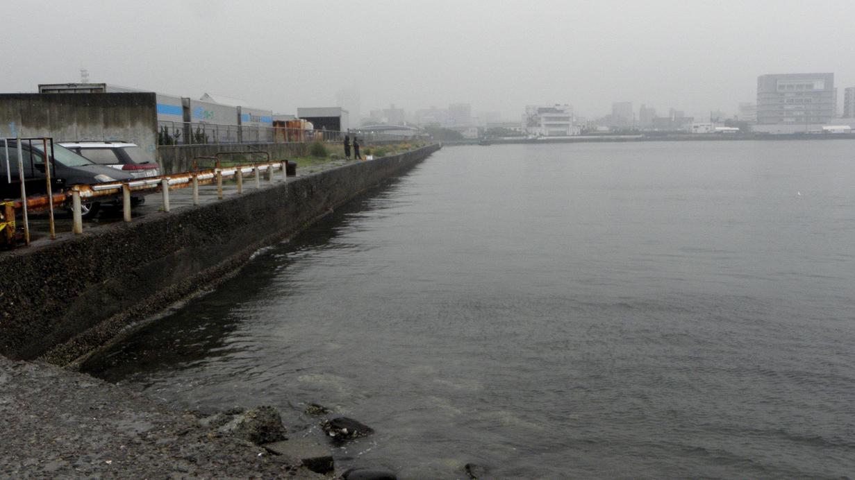休日には釣り人が多い西大分港も閑散としています。白灯台から赤灯台方面には一人の釣り人も居ませんが、湾内を見ると二人の釣り人がチヌを狙っています。