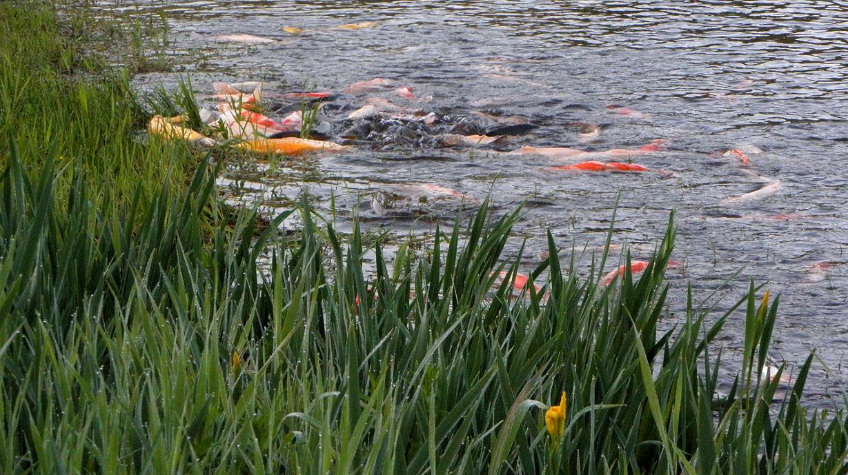コブハクチョウの雛も産まれています。湖面の岸辺にはおびただしい数のコイが産卵のために背びれを出しながら、あちらこちらでバシャバシャやっています。もうすでに、一ヶ月くらい続いているそうです。