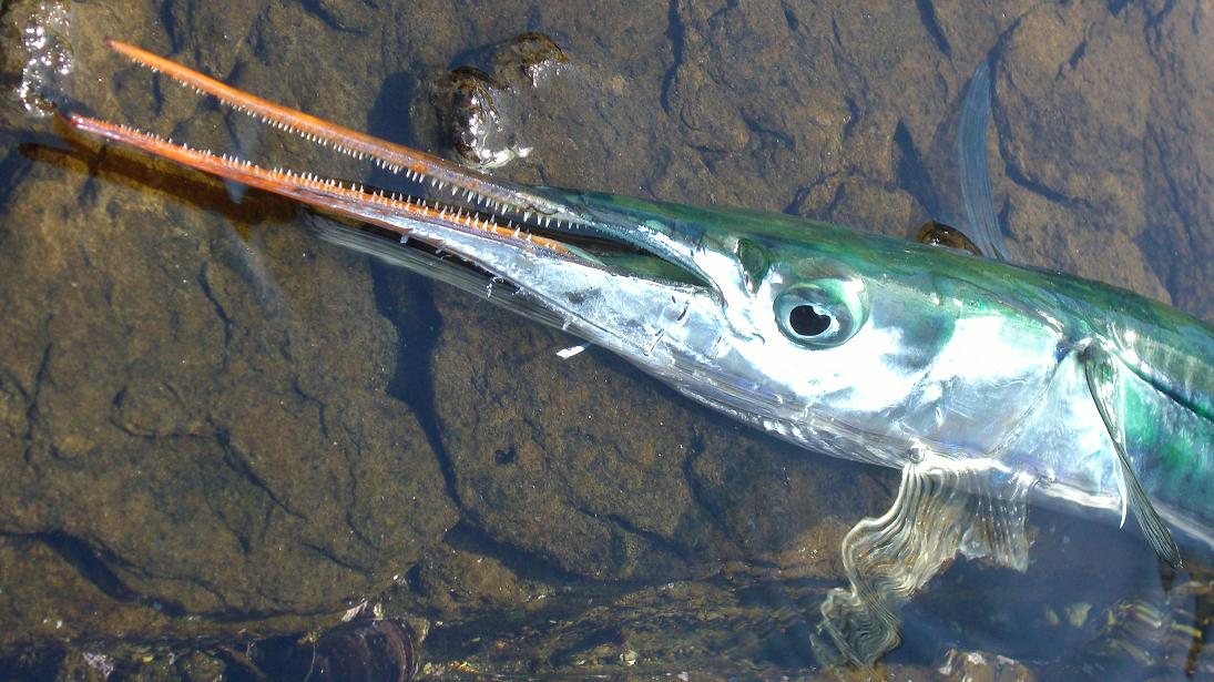 表層を泳いでおり、フカセ釣りで遠くまで流してダツが掛かった場合は、仕掛けが(サシエ)表層近くを流れている証拠!仕掛の入ってない事を確認する材料になる。