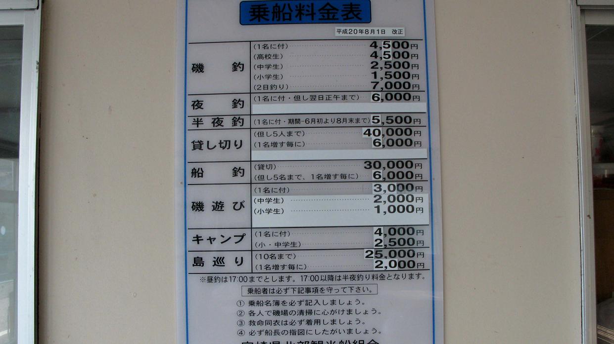 宮崎県、北浦・島野浦周辺の遊漁料金です